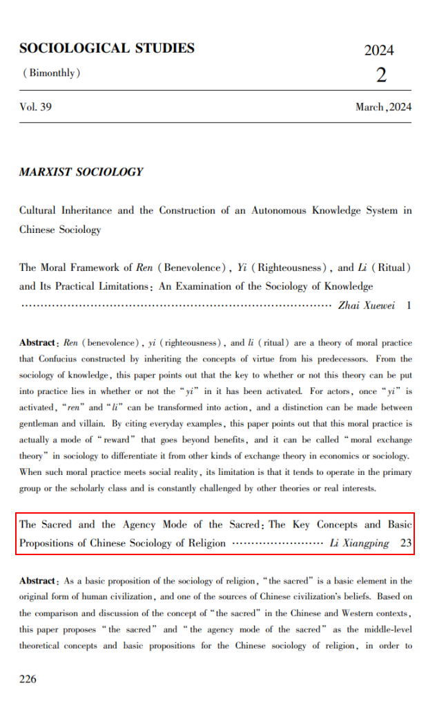 近日,beats365亚洲版李向平教授〈神圣与神圣者中介——宗教社会学中国化的核心概念和基本命题〉一文在中国社会科学院社会学研究所主办的《社会学研究》2024年第2期发表。该文系国家社会科学基金重大项目“中国特色宗教社会学话语体系及其本土知识结构研究”(18ZDA230) 的阶段性成果。