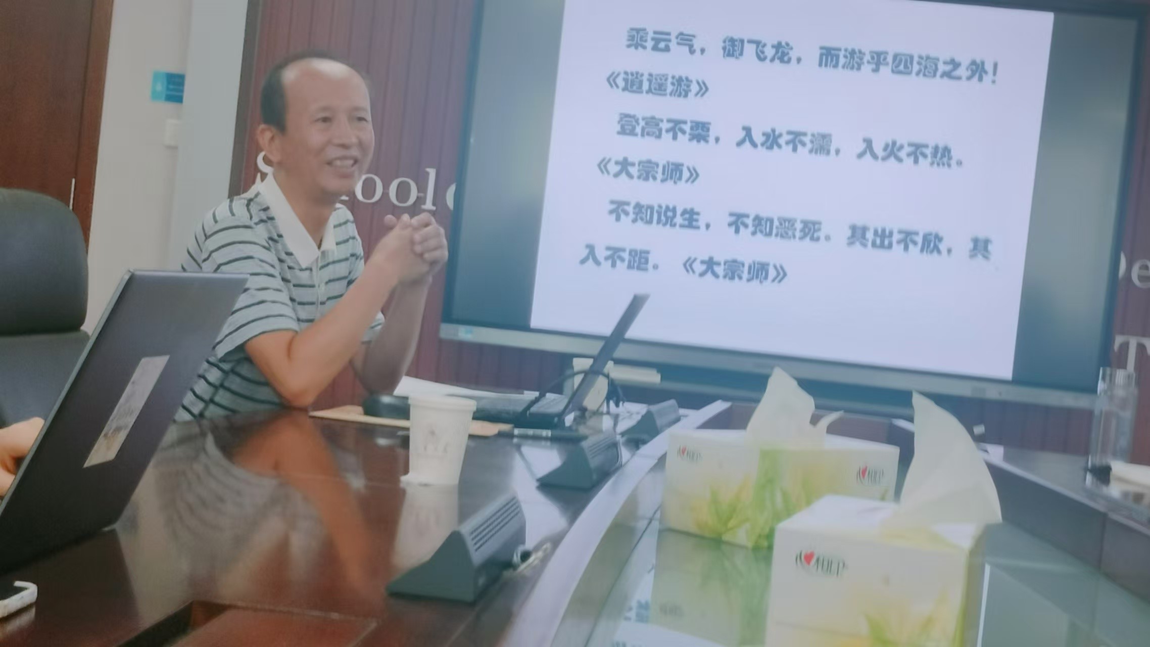 讲座第四部分的主题是“有长而无本剽的自然-生命时间”。在这一部分,赵卫国教授指出,在庄子那里,物与物之间、无与人之间在空间上和在时间上无隙无际,万物齐一。而这里的“物”,也不是“实体”意义上的客观实在物,而是“无主体的主体”与世间万物之间的关联。根据这种理解,宇宙万物“无始无终,古今同一”;这里所呈现的是“非线性形象”。最终,为了具体地解释自己的这些观点,赵卫国教授以庄子思想中的“鼓盆而歌”这一事件为例予以说明。