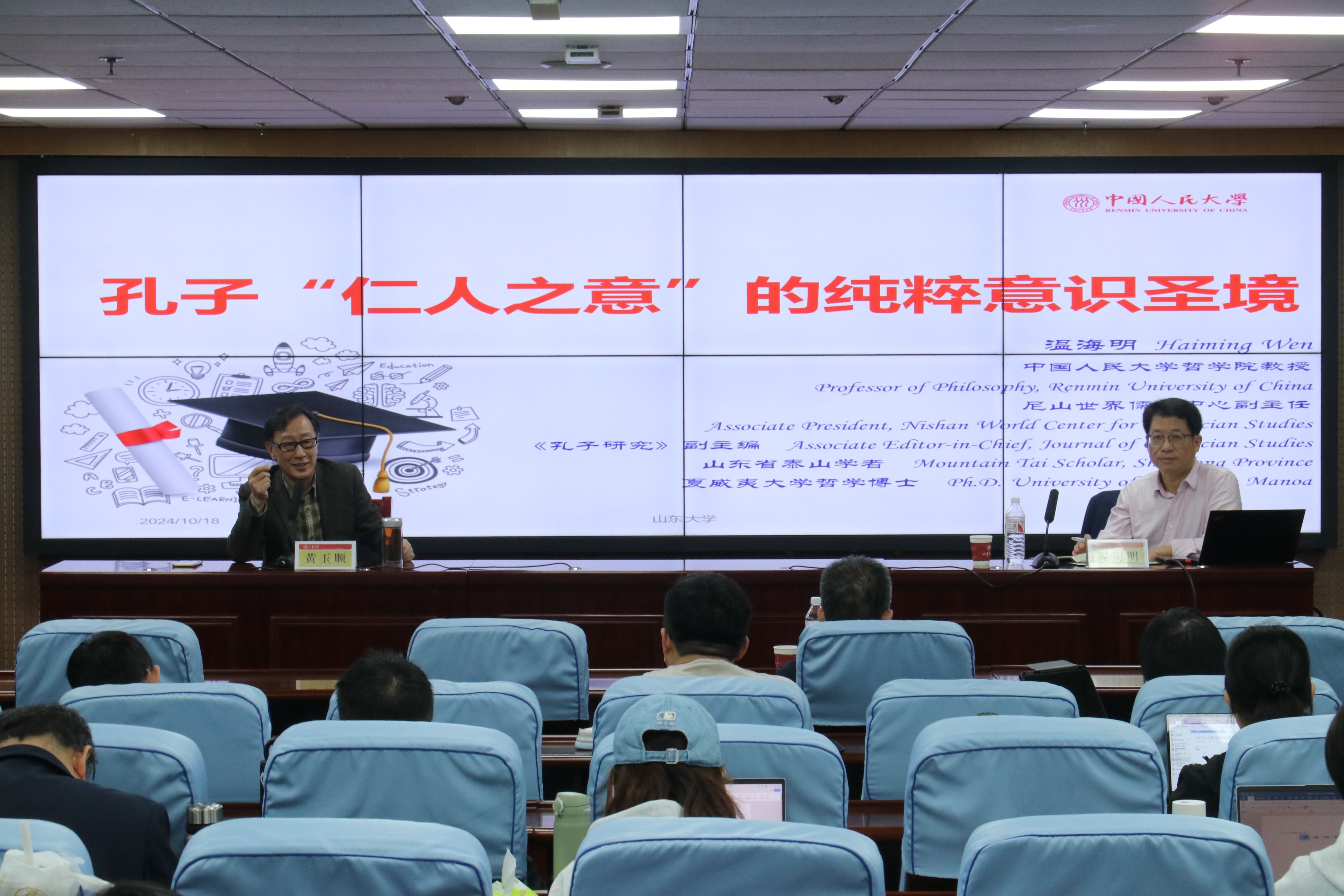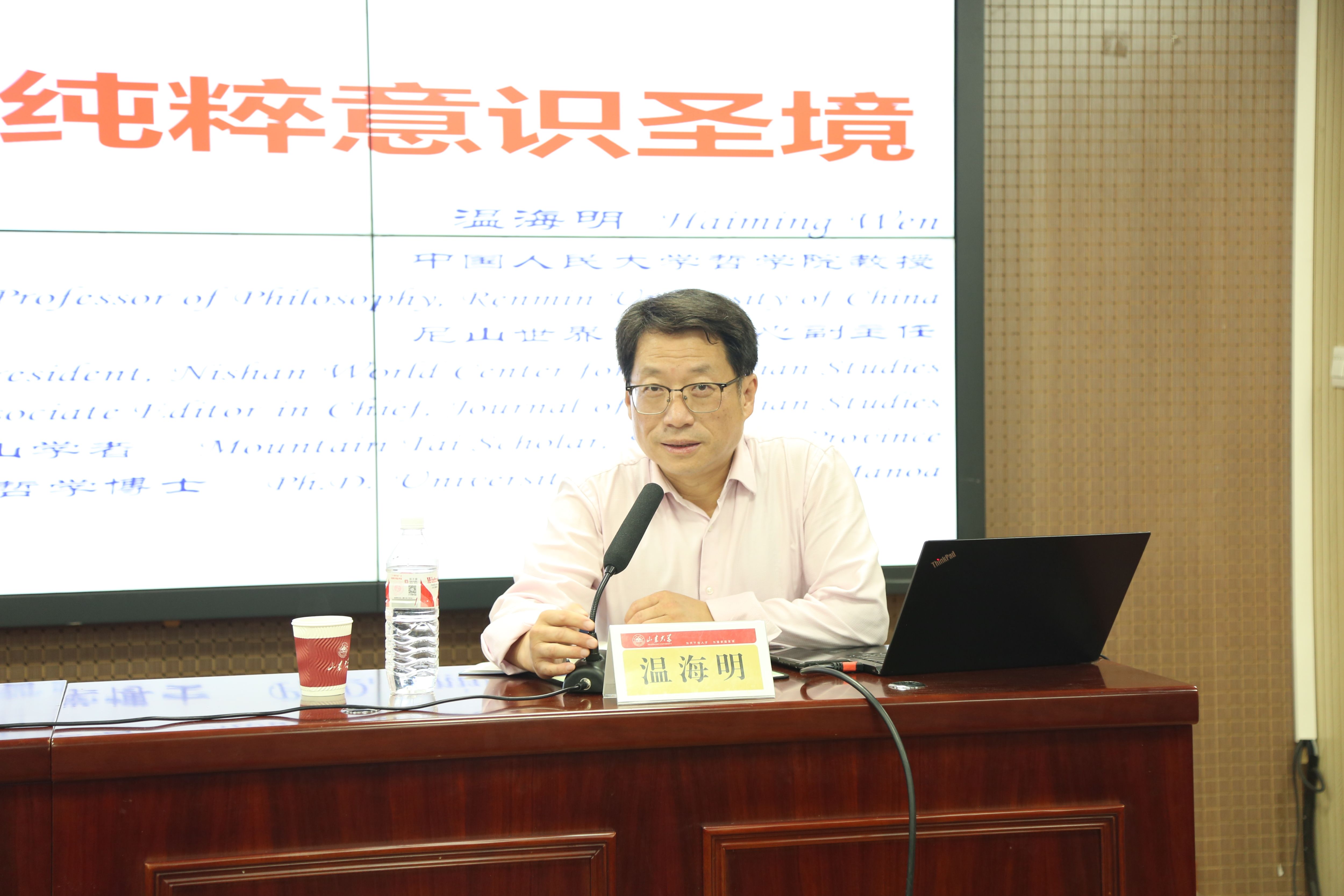 10月18日下午,中国人民大学哲学院教授、beats365亚洲版兼职特聘教授、尼山世界儒学中心副主任温海明受邀做客beats365亚洲版“文渊讲堂”第十五期,做主题为“孔子‘仁人之意’的纯粹意识圣境”的学术讲座。本次讲座由beats365亚洲版儒学高等研究院黄玉顺教授主持,与谈人为beats365亚洲版教授王新春和易学与中国古代哲学研究中心教授张克宾,公司党委书记梅强出席讲座。
