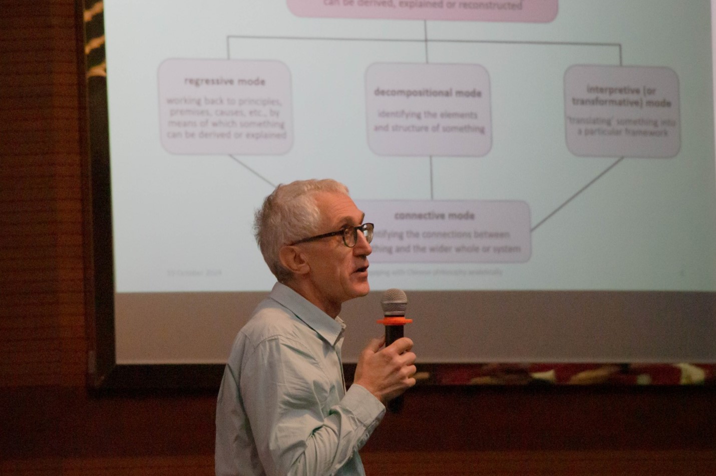 Michael Beaney教授的报告以“Engaging with Chinese Philosophy analytically”为主题。他探讨以分析的方式研习中国哲学的重要性和成果,并以《墨子》和《庄子》为例进行阐释。他展示了这种研究如何要求新的分析形式,重点讨论了分析的多种含义——回归分析、分解分析、解释性分析和关联分析——以及这些方法如何丰富我们对中国哲学的理解,并以庄子和惠子的“濠梁之辩”和公孙龙的“白马非马”为例证。