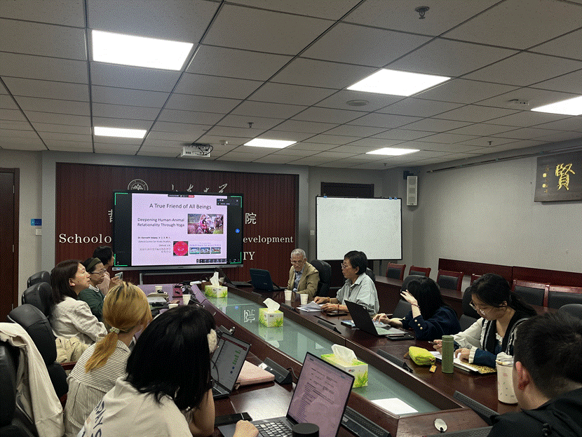 讲座内容引人深思,在场及线上的师生就瑜伽在中国的世俗化现象、瑜伽与动物保护之间的关系等问题与甘立夫教授展开激烈讨论。