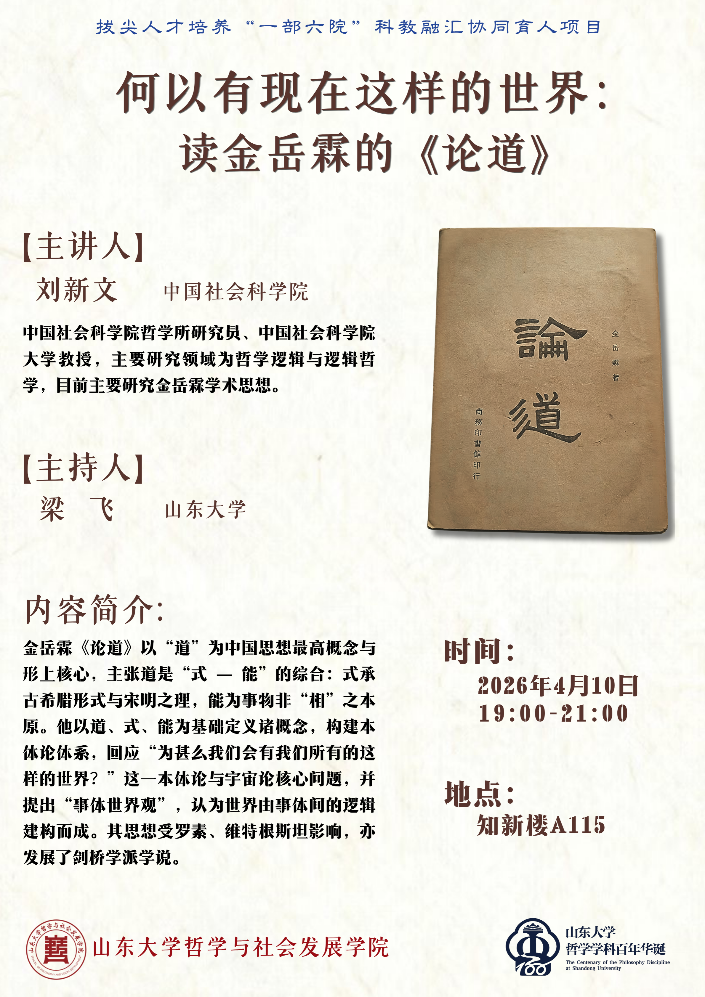 刘新文,中国社会科学院哲学所研究员、中国社会科学院大学教授,主要研究领域为哲学逻辑与逻辑哲学,目前主要研究金岳霖学术思想。讲座题为“何以有现在这样的世界:读金岳霖的《论道》”。
