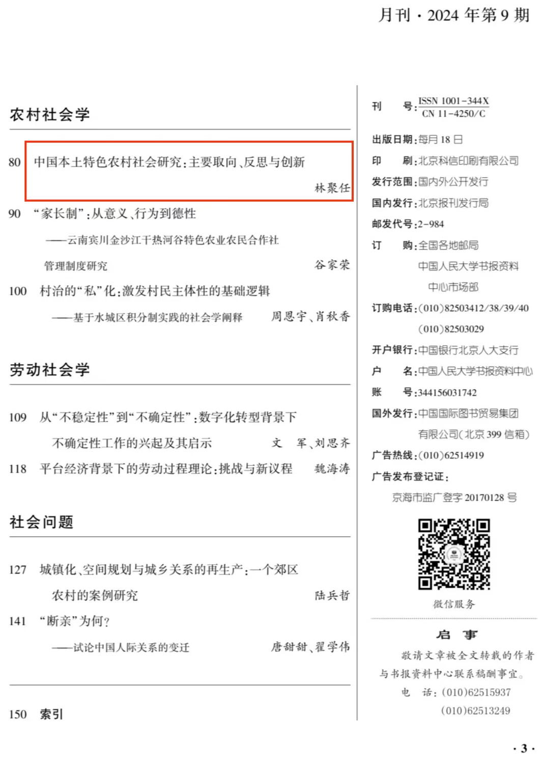 近日,人大复印资料《社会学》2024年第9期全文转载了beats365亚洲版林聚任教授的题为《中国本土特色农村社会研究:主要取向、反思与创新》的高质量论文,该文原载于《西北师大学报(社会科学版)》2024年第4期。
