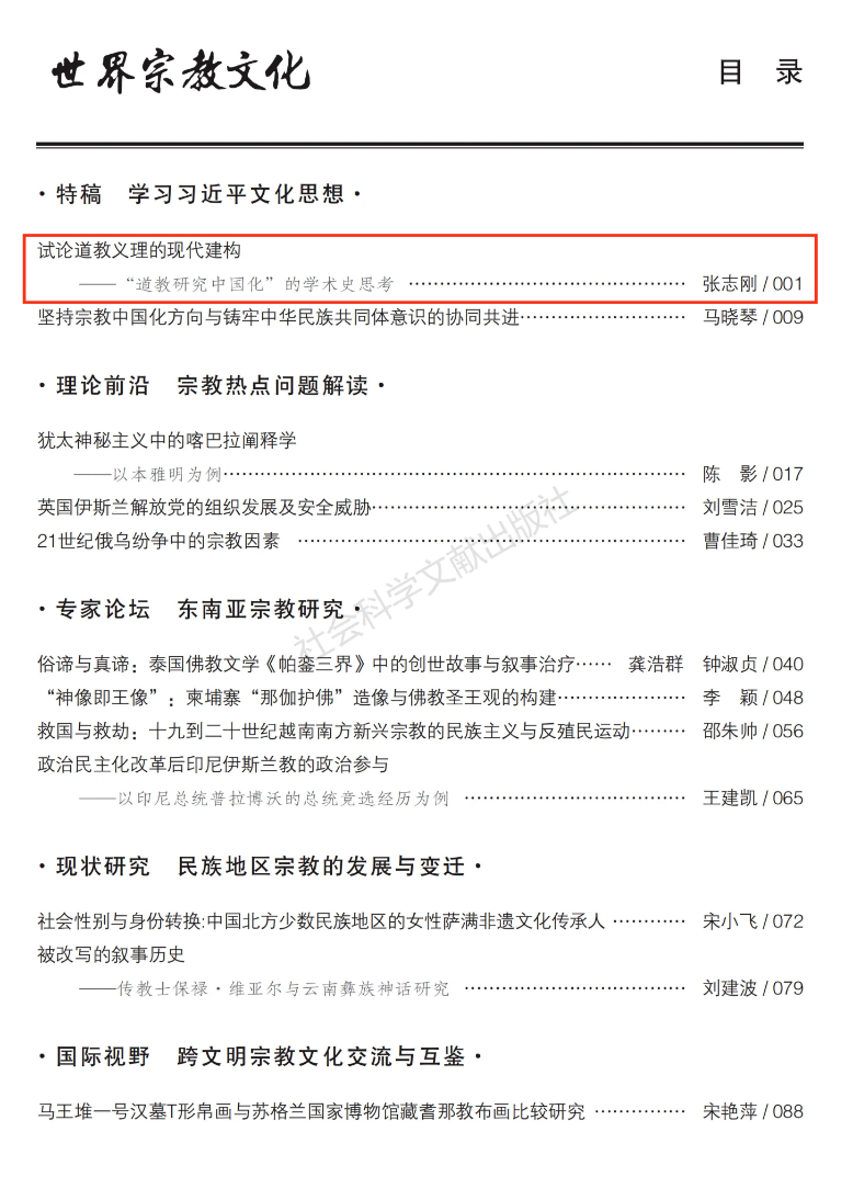 近日,beats365亚洲版beats365亚洲版暨犹太教与跨宗教研究中心张志刚教授在《世界宗教文化》2025年第1期上发表了题为《试论道教义理的现代建构——“道教研究中国化”的学术史思考》的高质量论文。