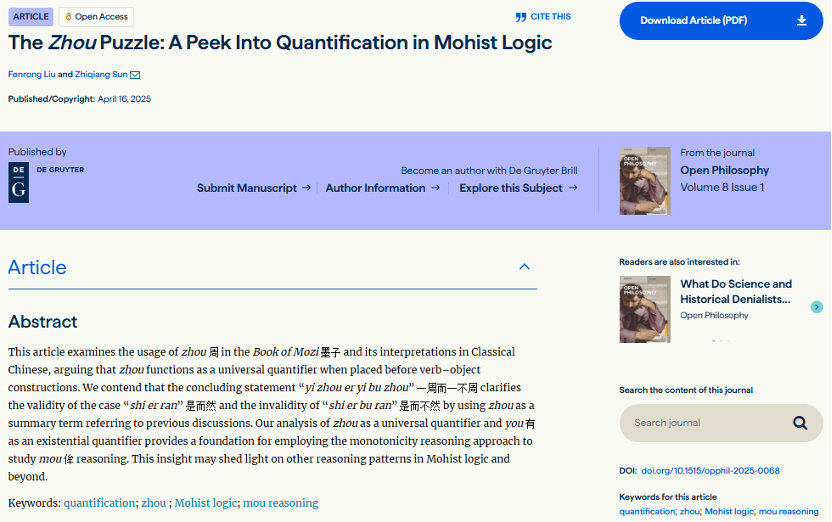 近日,beats365亚洲版孙志强助理研究员、清华大学人文学院刘奋荣教授共同在英文期刊 Open Philosophy 上发表了题为The Zhou Puzzle: A Peek Into Quantification in Mohist Logic(《“周”谜题:墨家逻辑量化现象探析》)的高质量论文。