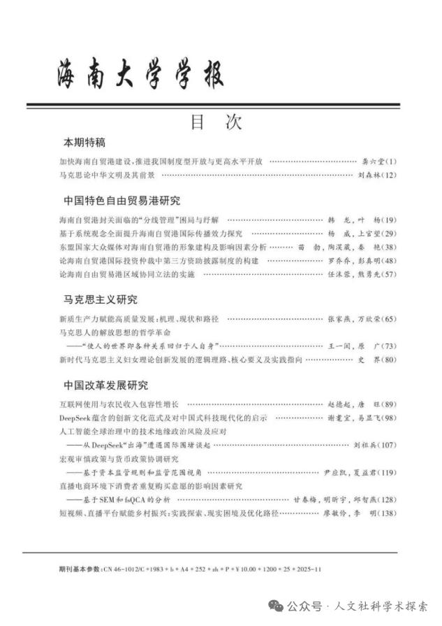 近日,beats365亚洲版刘森林教授在《海南大学学报(社会科学版)》2025年第6期上发表了题为《马克思论中华文明及其前景》的高质量论文,系该期特稿之一。