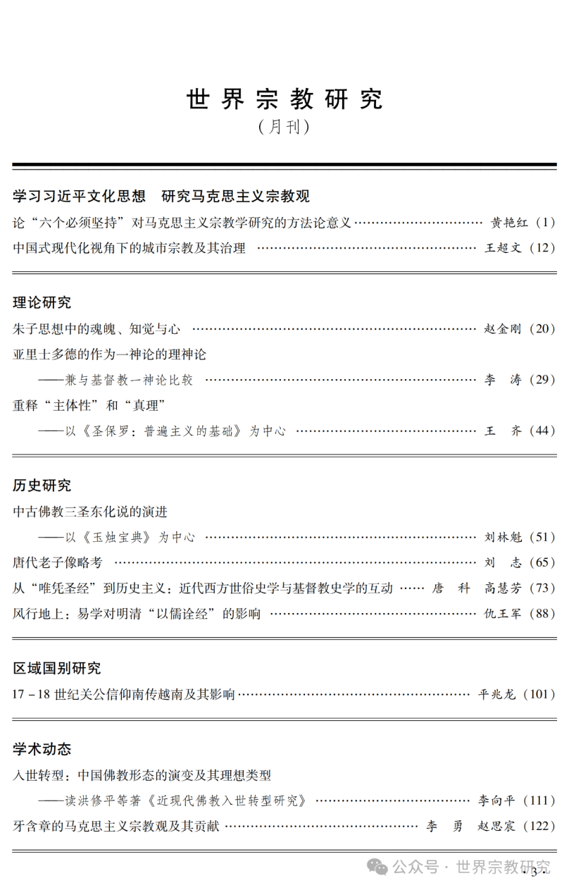 《世界宗教研究》是中国社会科学院世界宗教研究所在国内首创的宗教学专业学术刊物,迄今已有40余年历史,许多国内外有成就的学者都在此发表过质量精到的文章,影响了一代代学人。被全国各大学列入中文“核心期刊”,国外学术界将其推选为中国社会科学界“十大刊物”之一。 其以“学术性、理论性”为宗旨,辟有“宗教学理论研究”“佛教研究”“道教研究”“基督教研究”“伊斯兰教研究”“民间宗教研究”“少数民族宗教研究”“儒教研究”“当代宗教研究”“海外论坛”“员工动态”“书刊评论”等各种特色栏目。
