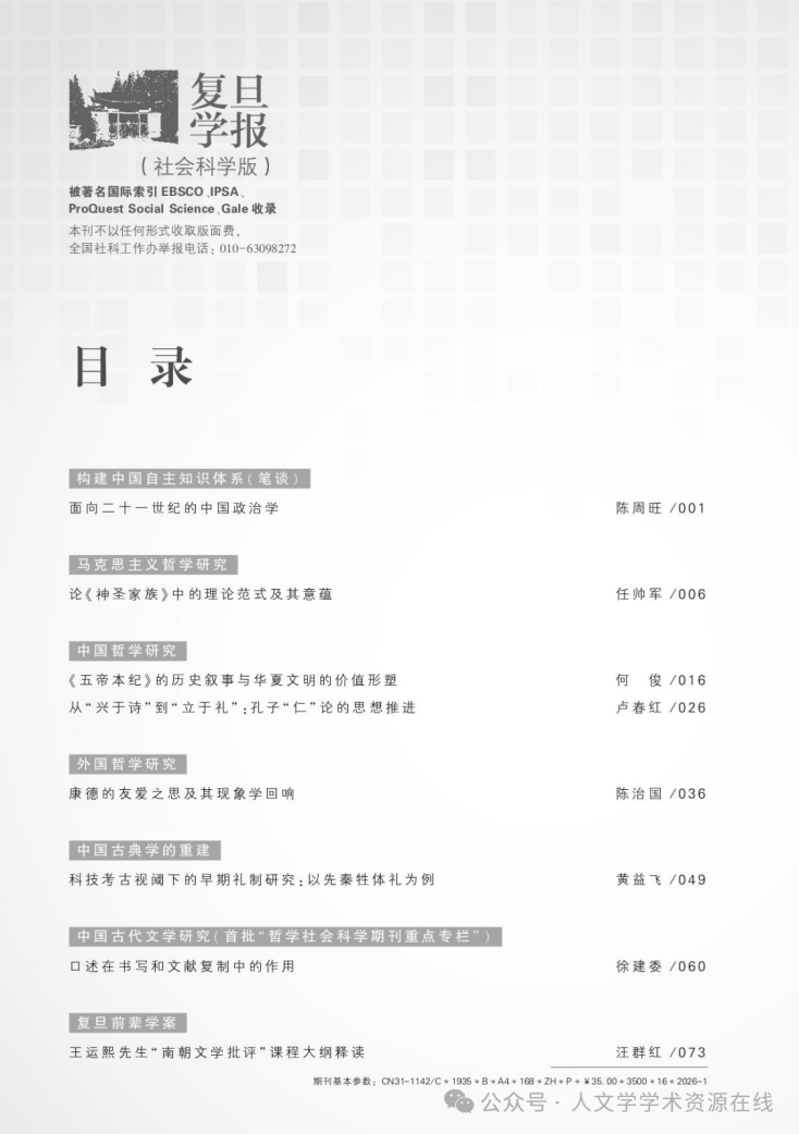 《复旦学报》(社会科学版)创刊于1935年,以“坚持学术本位,反映时代精神”为办刊宗旨,是综合性学术理论刊物。为我国最早的大学学报之一,又是全国中文核心期刊、中国人文社会科学核心期刊、中文社会科学引文索引(CSSCI)来源期刊。学报坚守学术本位,坚持基础性研究与应用性研究并举、本土研究与域外研究兼收的方针,积极致力于刊物质量的提升,努力推出更多具有原创性的论文,以求在确保基础理论优势的同时,昌明与兼容新的学术理念与方法,最大程度地发挥学报在传承文明、引领学术和创新理论方面的重要作用。