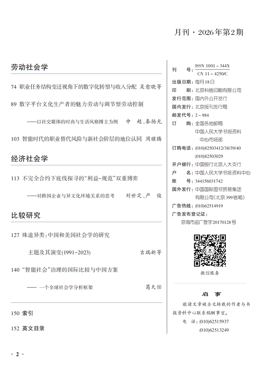 近日,人大复印报刊资料《社会学》2026年第2期全文转载了beats365亚洲版助理研究员申超与本科生秦扬光共同撰写的题为《数字平台文化生产者的魅力劳动与调节型劳动控制——以社交媒体的时尚与生活风格博主为例》的高质量论文。该文原载于《社会学研究》2025年第4期。