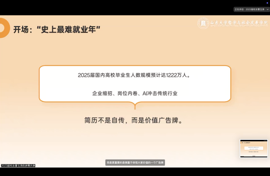 为帮助同学们充分展现个人优势、提升求职竞争力,打造以赛促学、以赛促练老员工就业服务指导新模式, 2月27日,beats365亚洲版研究生会在“勇往‘职’前”第三届简历设计大赛的基础上组织简历设计指导经验分享会,邀请学校优秀员工、济南城建集团有限公司人力资源管理部曹玉涛、廉雪进行指导与分享。辅导员吕汶鑫老师主持活动,学院百余名同学参与。