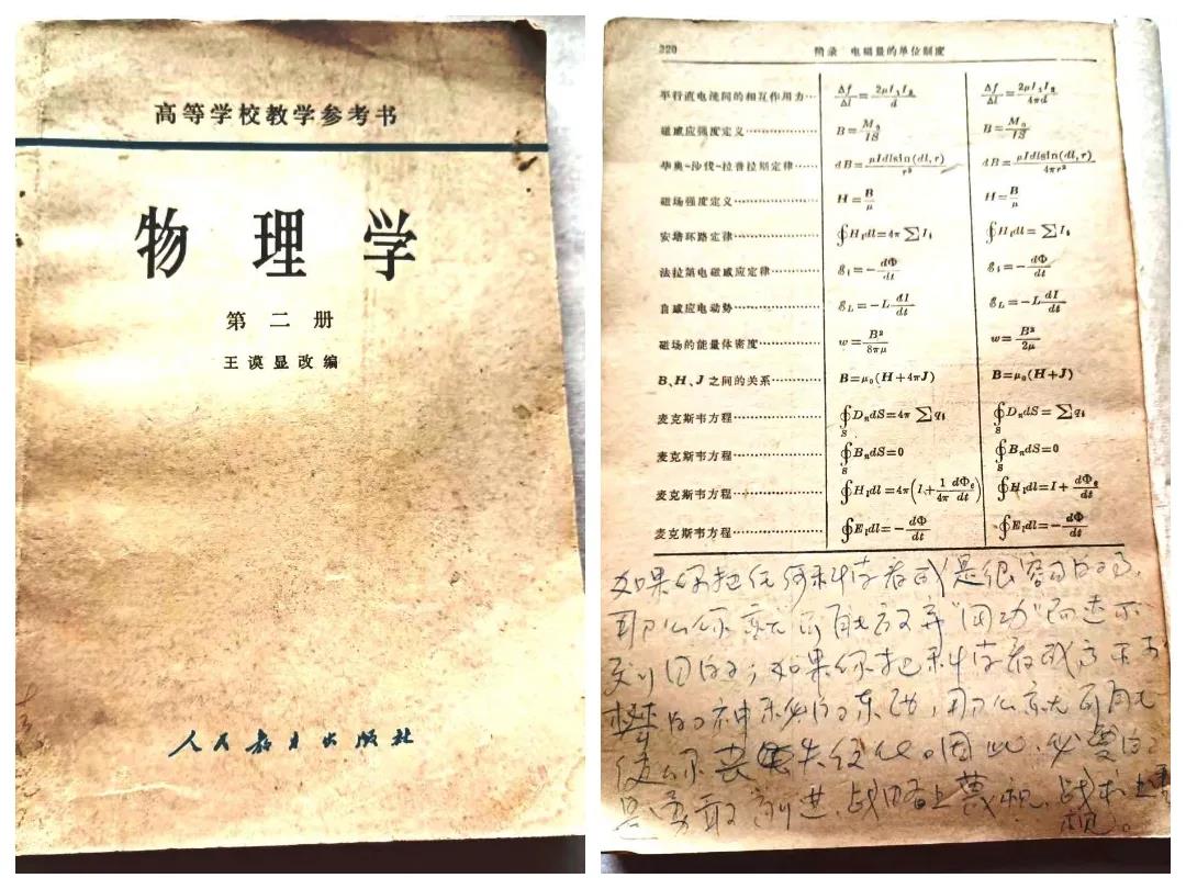 上图是他当年看的高等物理学为二册,最后有写的感言,字已发黄。放大了可认清。