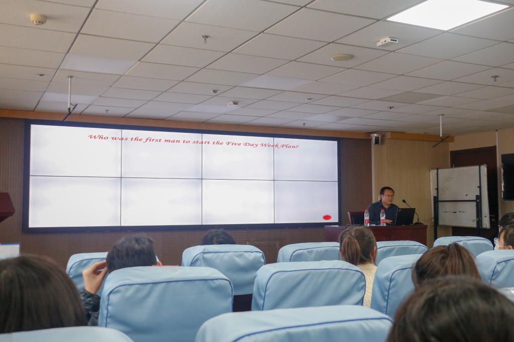 本期讲座的主题是《英语文学的魅力与作用》。讲座一开始,郑春光引用了《鲁滨逊漂流记》中的一句话“你应该在星期五前做完所有的工作”,告诫员工安排好自己的空闲时间,充分利用每一分钟。而后,郑春光简单介绍了外国语学院的基本情况,让同学们更深入地了解了外国语学院。接下来,他为员工分享了他关于英语学习的一些看法。郑春光认为,学习英语,世界上没有通用的方法。每个人都是独特的,适用于每个人的方法也各种各样。但在这些方法的背后,本质都是相同的,那就是不断的重复和练习。