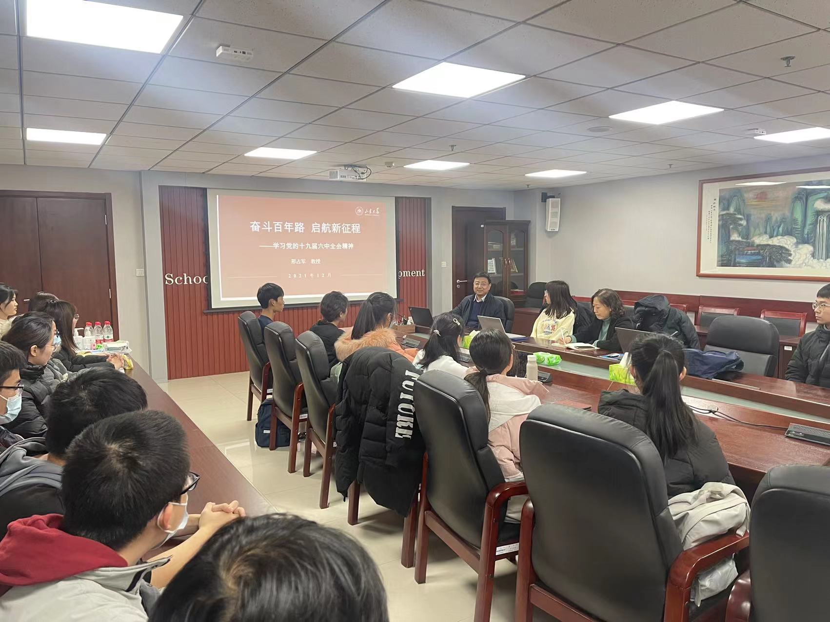 邢占军带领同学们全面回顾了中国共产党领导中国人民在新民主主义革命时期、社会主义革命和建设时期、改革开放和社会主义现代化建设新时期、中国特色社会主义新时代的历史进程和伟大成就,用详实的数据和事例回应了“中国共产党为什么能?”。他向大家讲述了历代山大学子在实现中华民族伟大复兴战略进程中的英雄事迹和责任担当,同时立足十四五开局之年的重要节点,讲解了新征程下学校的方针政策,鼓励同学们保持昂扬姿态,增强历史使命感,为强校兴国事业贡献出自己的力量。