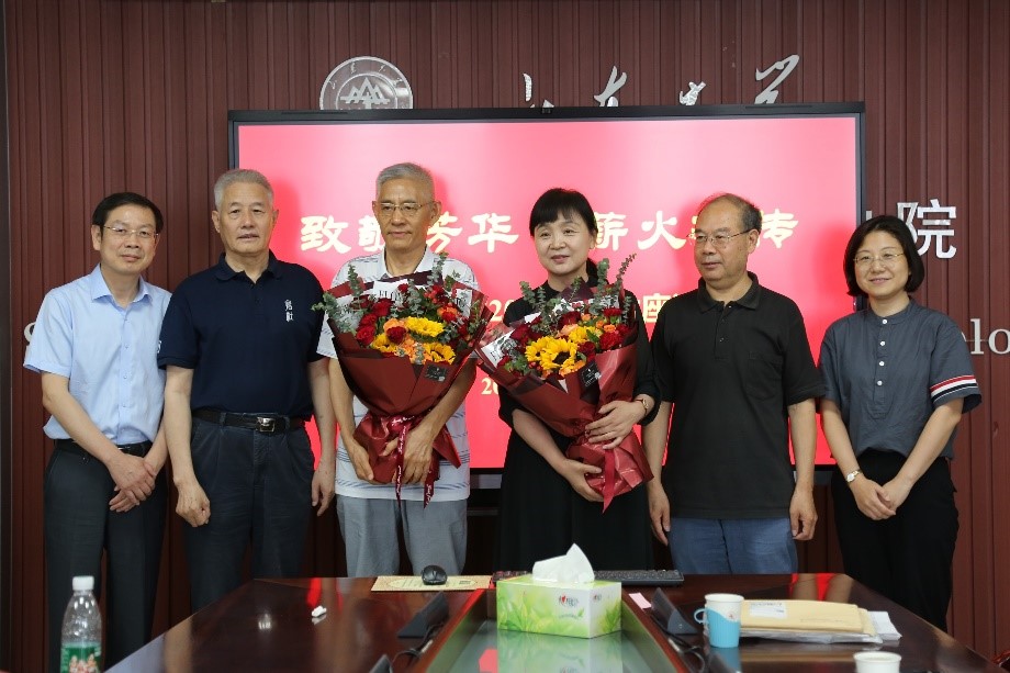 座谈交流后,学院班子及教师代表为两位荣休教师敬献了鲜花,全体参会人员合影留念,荣休仪式在温馨和谐的氛围中圆满落幕。整个活动,不仅体现了学院对教职员工的尊重、爱护与关怀,也彰显了中华民族尊师重教的优良传统,激励着新时代教师和学子见贤思齐,励志为学校事业发展和教育强国建设贡献自己的青春与力量。