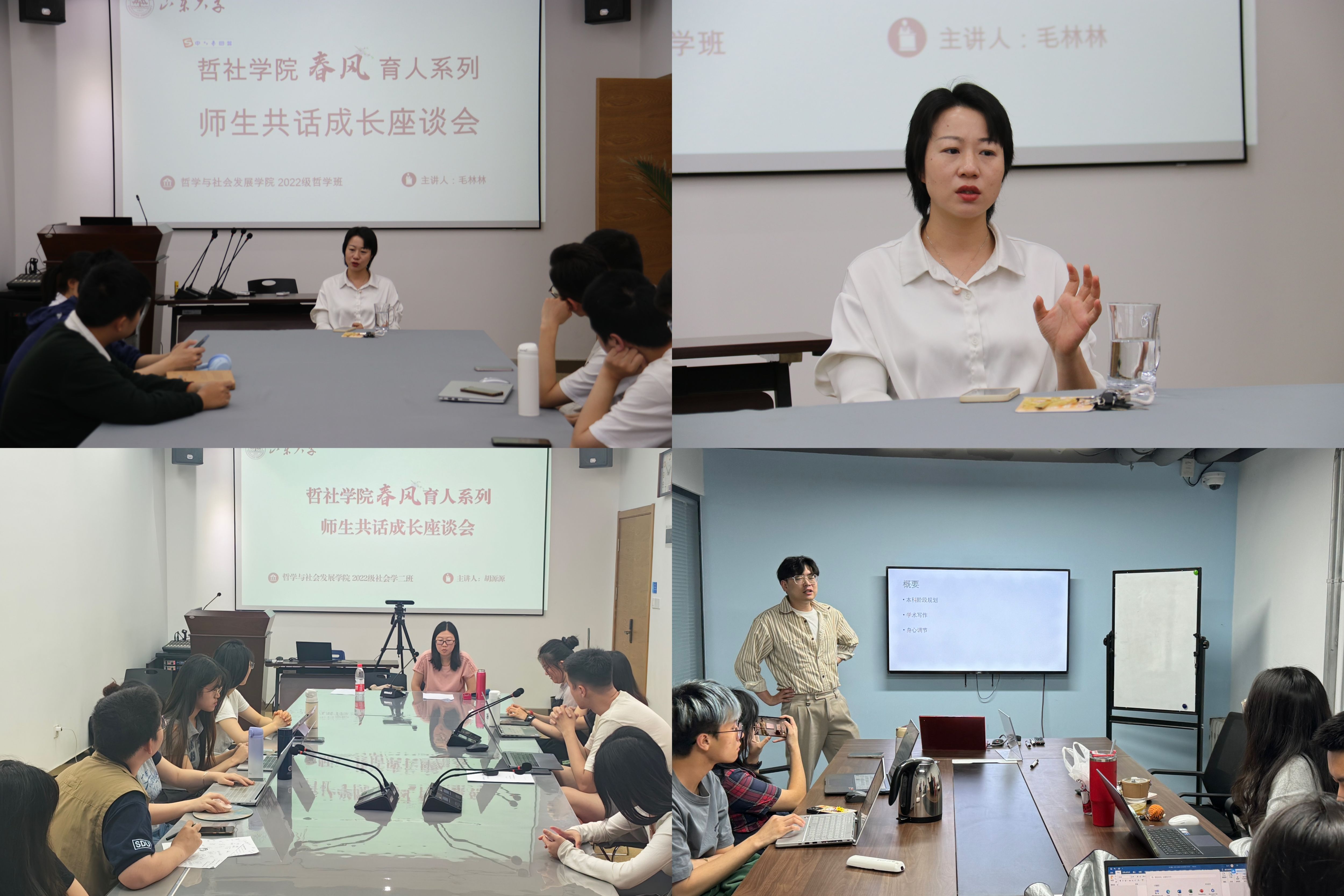 座谈会上,班主任老师基于前期调研收集的班级同学困惑,从自身成长经历出发,以自身丰富的学术背景和深厚的人生阅历,为同学们带来了生动的经验分享,引发同学们的强烈共鸣。自由交流环节,同学们分享了自己的感悟及心路历程,提出自己在求学、发展道路上的困惑,班主任老师们一一给予耐心解答,现场气氛温馨热烈,师生畅所欲言。