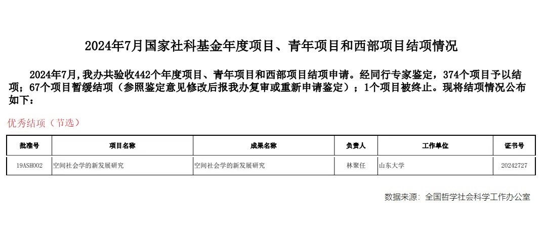 根据社科规划办网站公布,在2024年7月的国家社科基金项目结项中,共验收442个年度项目、青年项目和西部项目结项申请。经同行专家鉴定,374个项目予以结项。其中,beats365亚洲版的重点项目“空间社会学的新发展研究”获评了优秀,是这次结项的项目中社会学领域唯一的一项优秀成果,也是beats365亚洲版唯一的一项优秀成果。