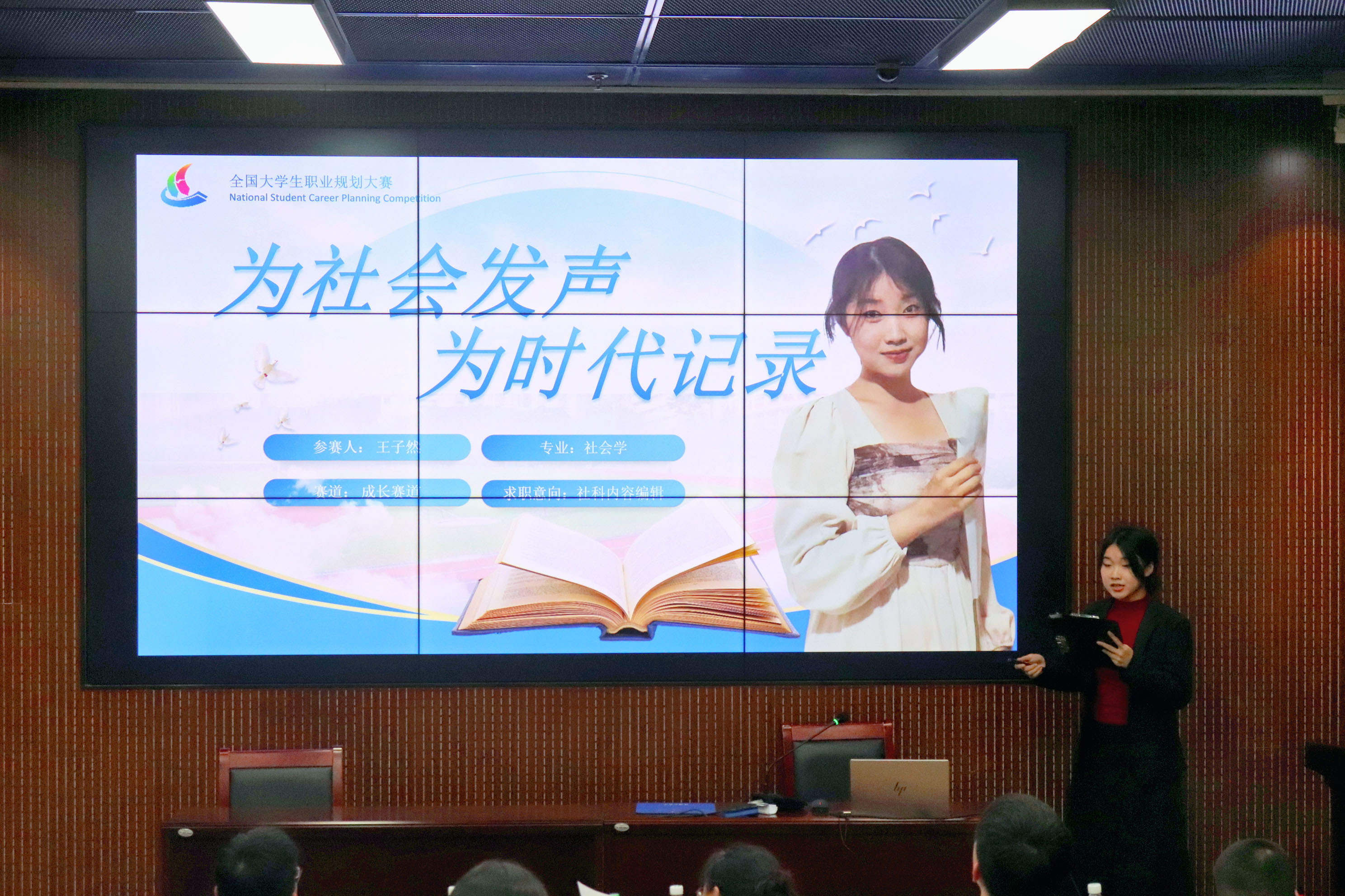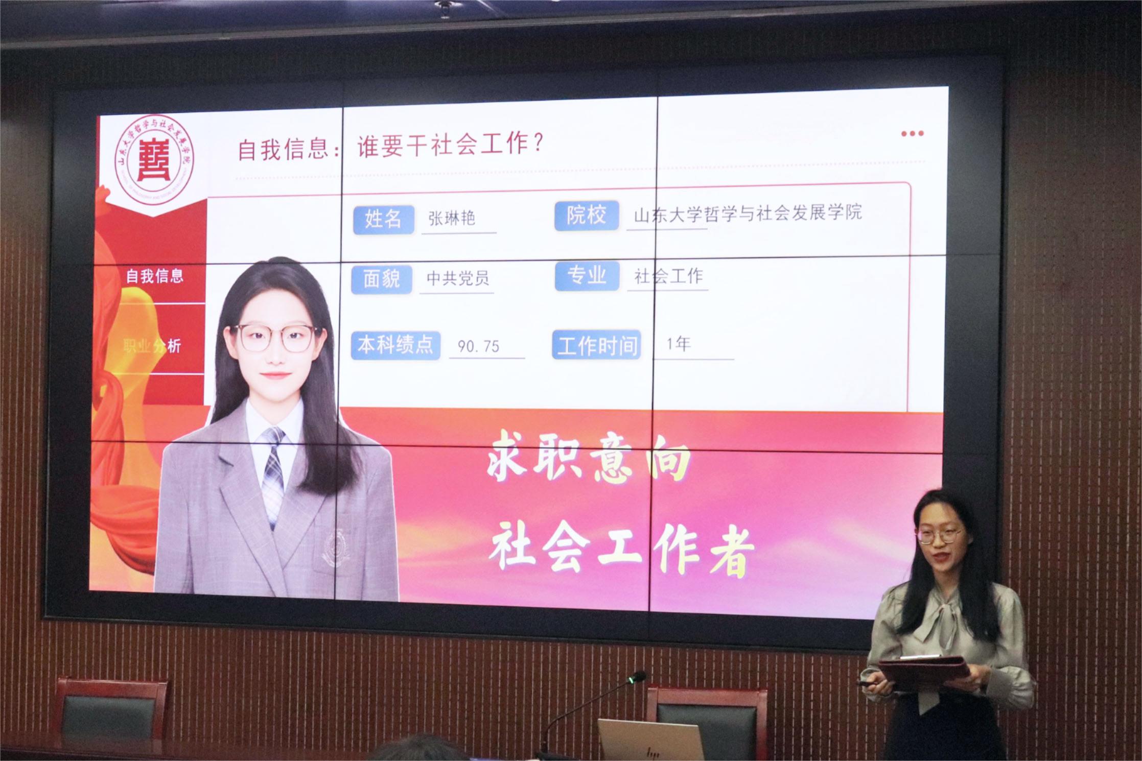经过前期的广泛宣传与初步选拔,学院共有百余名同学报名参赛,经材料初筛后共有21名选手进入决赛答辩。参赛选手依次围绕自我评价、职业理想、发展规划等方面展开个人陈述。2024级本科生杨欣琪深受社工情怀的影响,期待成为一名“非普通”社会工作者,在服务助人第一线发挥个人价值。2022级本科生刘纾言以高校思政教师为成长发展目标,沉谋研虑、细致规划,立志成为一名勇担强国使命,投身教育事业的思政教师。2024级硕士研究生竹雅将高校辅导员作为求职目标,给出客观中肯的自我评价和明确清晰的职业发展路径,展现出扎实的综合素养。评委老师依据陈述内容进行提问,并提出内容优化建议。
