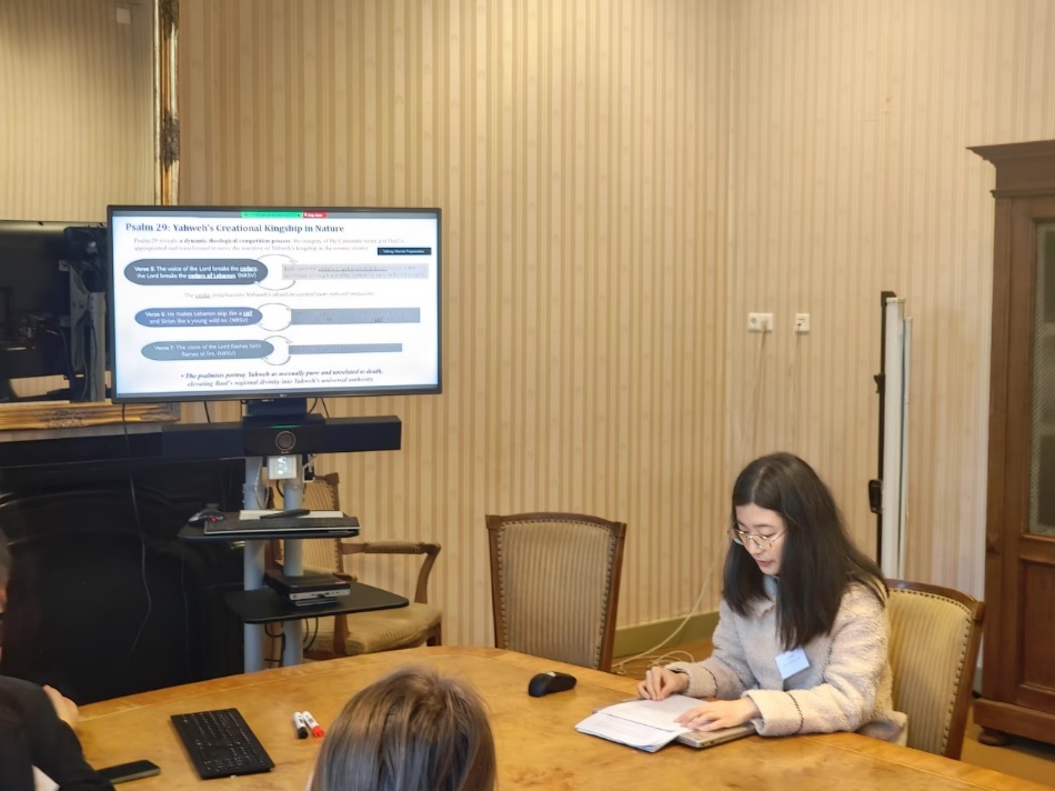 于雅轩发表论文“Competitions of Yahweh's Images: A Comparative Study of Psalms 29 and 74 in the Context of Scribal Culture in the Second Temple Period”。该研究深入解析了迦南神话元素与希伯来圣经文本之间的互文性,围绕《诗篇》29、74及《约伯记》26章这三处重要经文展开探讨,重点关注这些文本在第二圣殿时期文士文化背景下所经历的编修与再诠释过程,分析了雅威王权意识形态的多元性。研究指出,第二圣殿时期的文士群体在吸纳、转化和重塑传统神话元素的过程中,赋予了雅威形象更为丰富的内涵,以此回应流放后的以色列社会对信仰重建和群体认同的迫切需求。报告引发了与会学者的积极讨论,有学者就《诗篇》文本的编修以及迦南宗教元素的融入等问题展开了深入交流。
