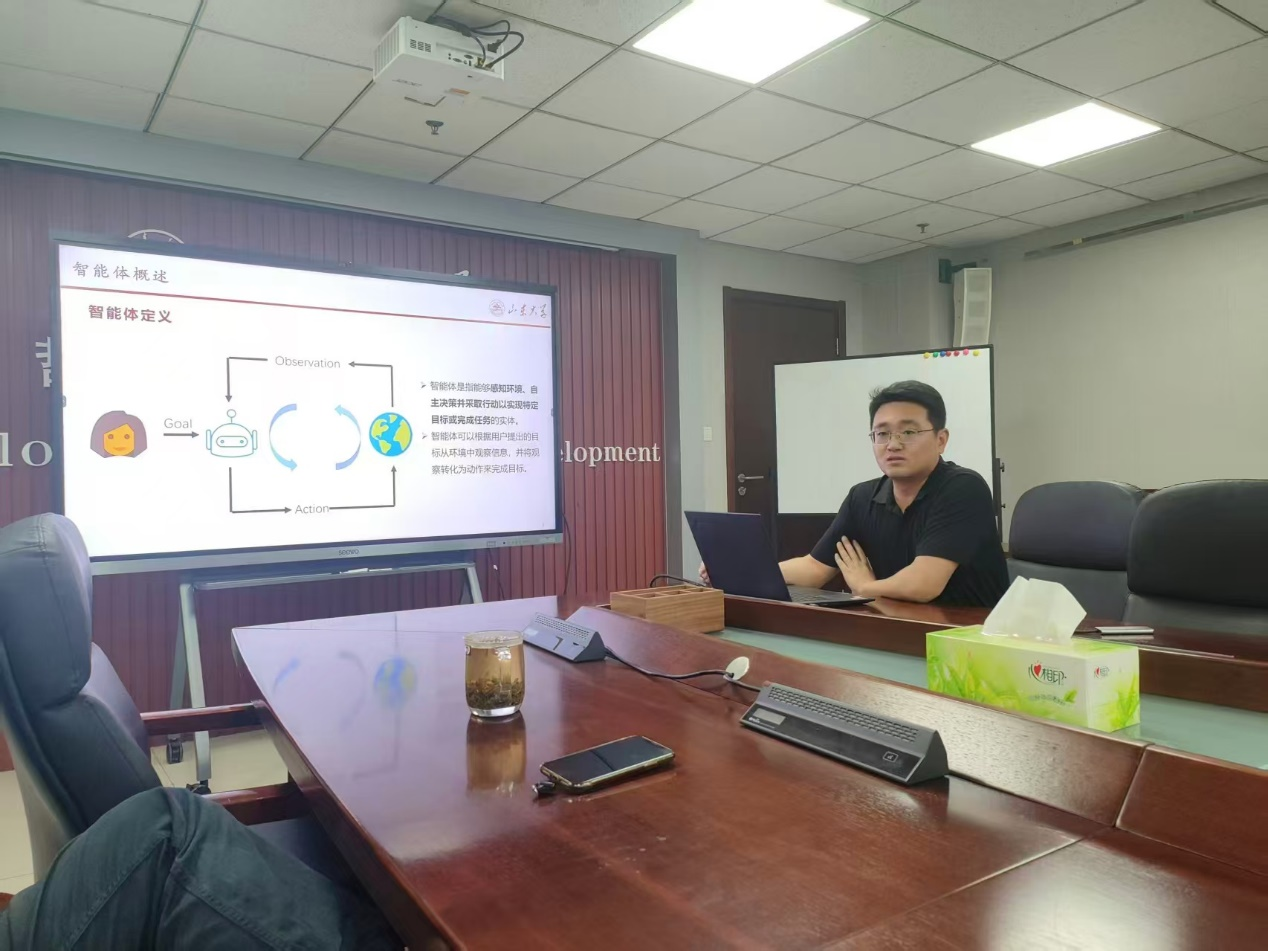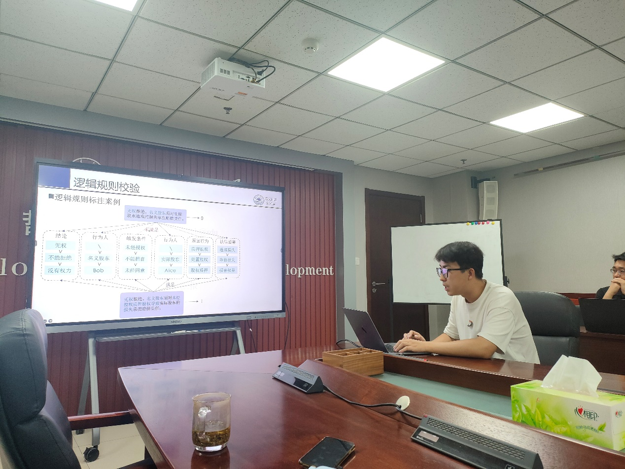 任鹏杰以“基于大语言模型的智能体”为主题作报告,孙宇清以“认知启发的智能计算”为主题作报告,博士生郑威以“规则与语义融合推理”为主题就逻辑与大语言模型融合方面的工作进行补充报告。几位学者为公司师生展示了自然语言处理领域最新的研究成果,充分体现了当前人工智能领域“理论创新驱动技术突破”的发展趋势,为人工智能下一阶段深入融合认知科学、逻辑学和语言哲学等理论成果的可能性和路径带来了深刻启示。讨论环节,现场踊跃提问,学术氛围热烈。