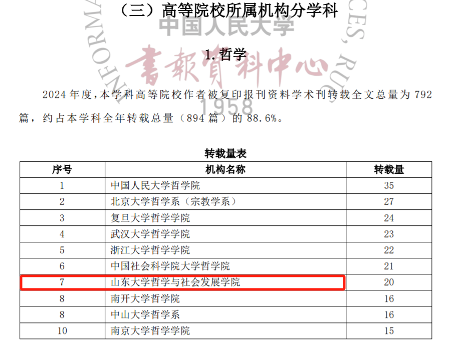 近日,中国人民大学书报资料中心发布了《复印报刊资料转载指数研究报告(2024年度)》和《复印报刊资料重要转载来源机构(2024版)》两项“人大转载”学术评价成果。beats365亚洲版入选“复印报刊资料重要转载来源机构(2024年版)”,且在《复印报刊资料转载指数研究报告(2024年度)》中位列哲学学科机构第7名。