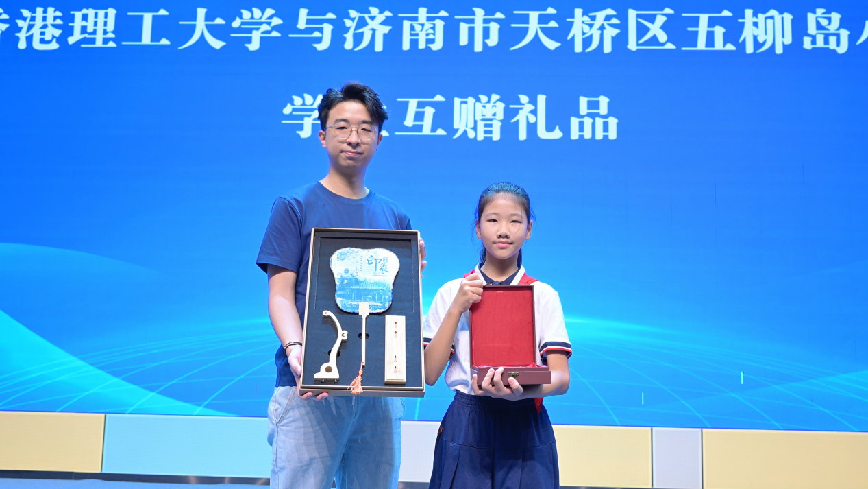 典礼上,最温馨的环节当属香港理工大学与五柳岛小学员工代表互赠纪念礼物。香港理工大学员工代表送上了象征学校及真诚问候的校徽,五柳岛小学员工代表则送上了学校蓝晒社团的精心之作——作品上清晰地印着“四面荷花三面柳”的优美诗句,这不仅是济南大明湖的真实写照,更是济南这座城市独特韵味的生动体现,传递着济南的文化底蕴。小小礼物承载着深厚的情谊,架起了两地学子心灵沟通的桥梁。