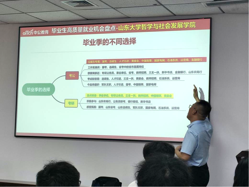 随后,学院邀请了专业生涯规划讲师从招考形势、信息获取、明确取舍等维度出发,针对毕业去向问题答疑解惑。他立足于“秋招—国考—选调—春招”的全周期节奏,重点解读国考、省考、选调、军队文职、事业单位、人才引进等优势报考路径,提醒同学们“用好应届身份、盯紧信息源头、早做复习规划”。会议现场,郝广义还就简历诊断、面试表达、时政积累等层面,面向全体22级同学给出求职素养提升方案。