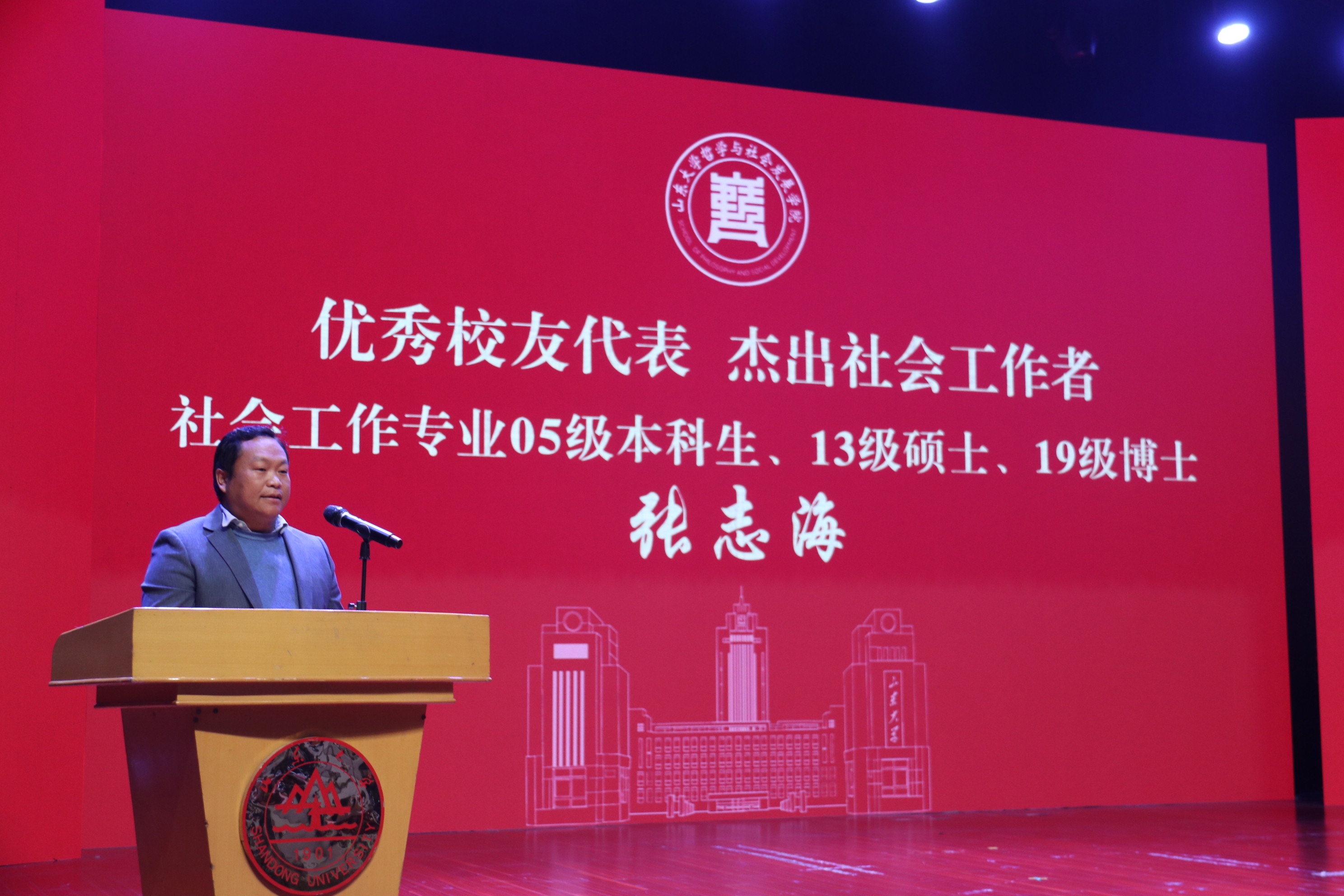 济南市信望爱残疾人服务中心总负责人、知名社会工作者、学院社会工作专业2005级本科生、2013级硕士、2019级博士张志海作为优秀员工代表发言。他以“从‘无用’处积累,向‘社会’扎根——我的大学,我的成长坐标系”为主题,分享了自己的求学与工作经历。他鼓励同学们学好学校课堂理论知识、专业知识的同时,也要读懂社会服务和专业实践这本“书”,要主动走进社会一线,在服务他人、奉献社会中实现专业价值与人生意义。