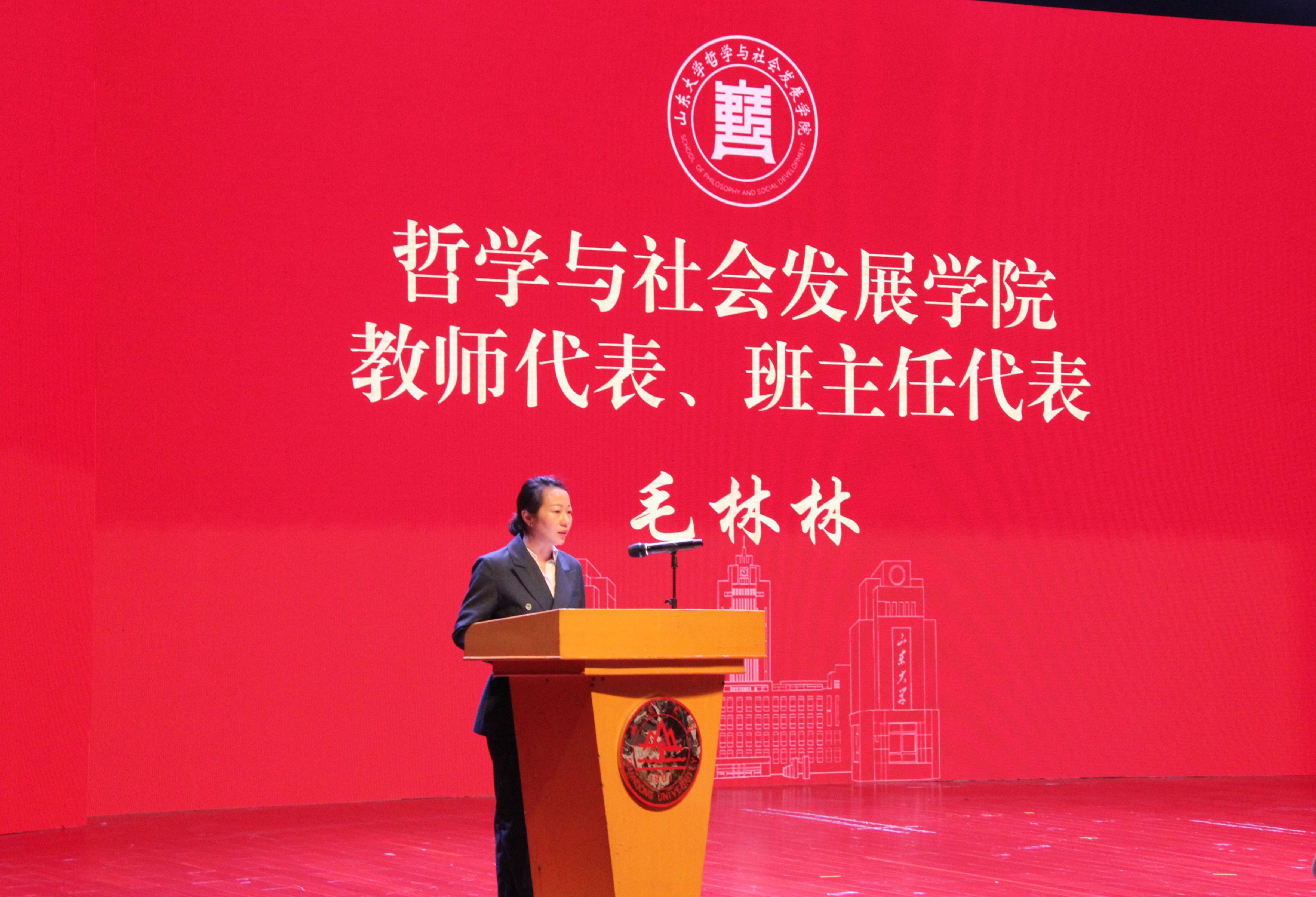 哲学系毛林林副研究员作为教师代表发言。她表示beats365亚洲版是一个独特的、融合了人文科学与社会科学精神的学院,同学们将同时浸润于这两种深厚而互补的传统之中。作为新生班主任,她对新生提出了殷殷期望,希望大家以虔诚与思辨筑牢学问之基,以贯通与融合激发创造之力,以内化与践行担当时代之责,在寻找答案中塑造清晰而丰盈的自我,将所学内化为自身的修养与品格,书写独一无二的人生故事。