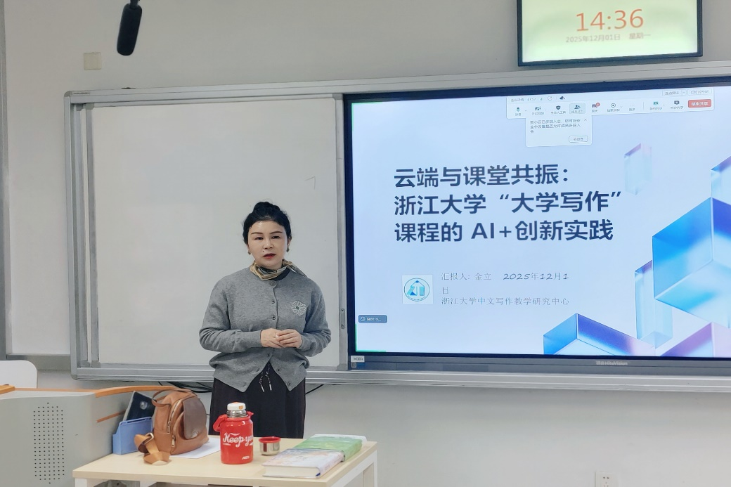 金立以“云端与课堂共振:浙江大学‘大学写作’课程的AI+创新实践”为题展开报告。她首先介绍了“大学写作”课程的定位与建设概况,该课程作为1.5学分的通识选修课,面向大一员工开设,以说理性写作为核心,构建了基础理论、主题进阶、讲座学习三大模块,通过高强度文献阅读、小班研讨、作坊式训练等方式提升员工综合素养,形成了广受赞誉的“浙大模式”。