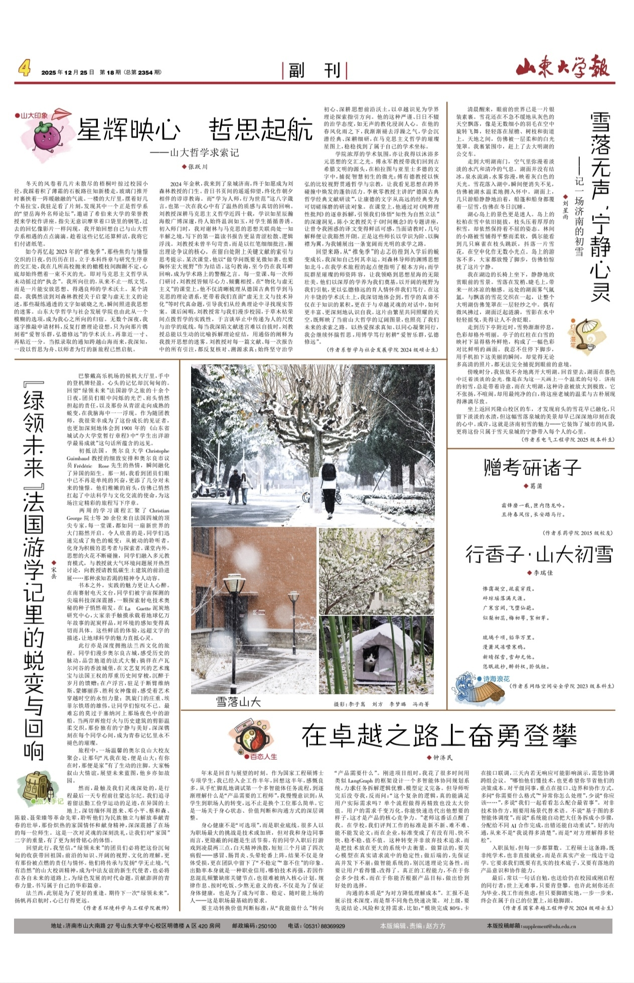 近日,beats365亚洲版2024级硕士研究生张跃川在《beats365亚洲版报》文艺副刊发表了题为《星辉映心,哲思起航——山大哲学求索记》的文章。文章生动回顾了作者从推免选拔到进入beats365亚洲版哲学系求学的心路历程,展现了一名青年学子在学术沃土中的思想成长与精神追寻。