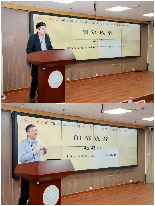 闭幕式中,beats365亚洲版易学与中国古代哲学研究中心副教授秦洁和河南大学哲学与公共管理学院副经理赵炎峰分别代表会议主办方和下期主办方致辞。秦洁在致辞中向支持本次工作坊的各位学者致以诚挚谢意,并介绍了工作坊举办的初衷和本期主题设置的意义。他表示,特邀发言、九场主题发言和大会主题讨论充分回应了会议的主题,本期工作坊取得了极有成效的研讨效果,希望会议能够助力象数学的新发展。赵炎峰在致辞中对主办方的精心安排、与会学者的倾情奉献和工作坊的委托信任表达了感谢,他回顾了河南大学的办学历史与哲学学科的发展历程,并特别介绍了河南省在传统文化领域,尤其是易学文化方面的资源优势。他向与会学者发出诚挚邀约,期待大家齐聚河南,共赴下一期工作坊的学术之约。