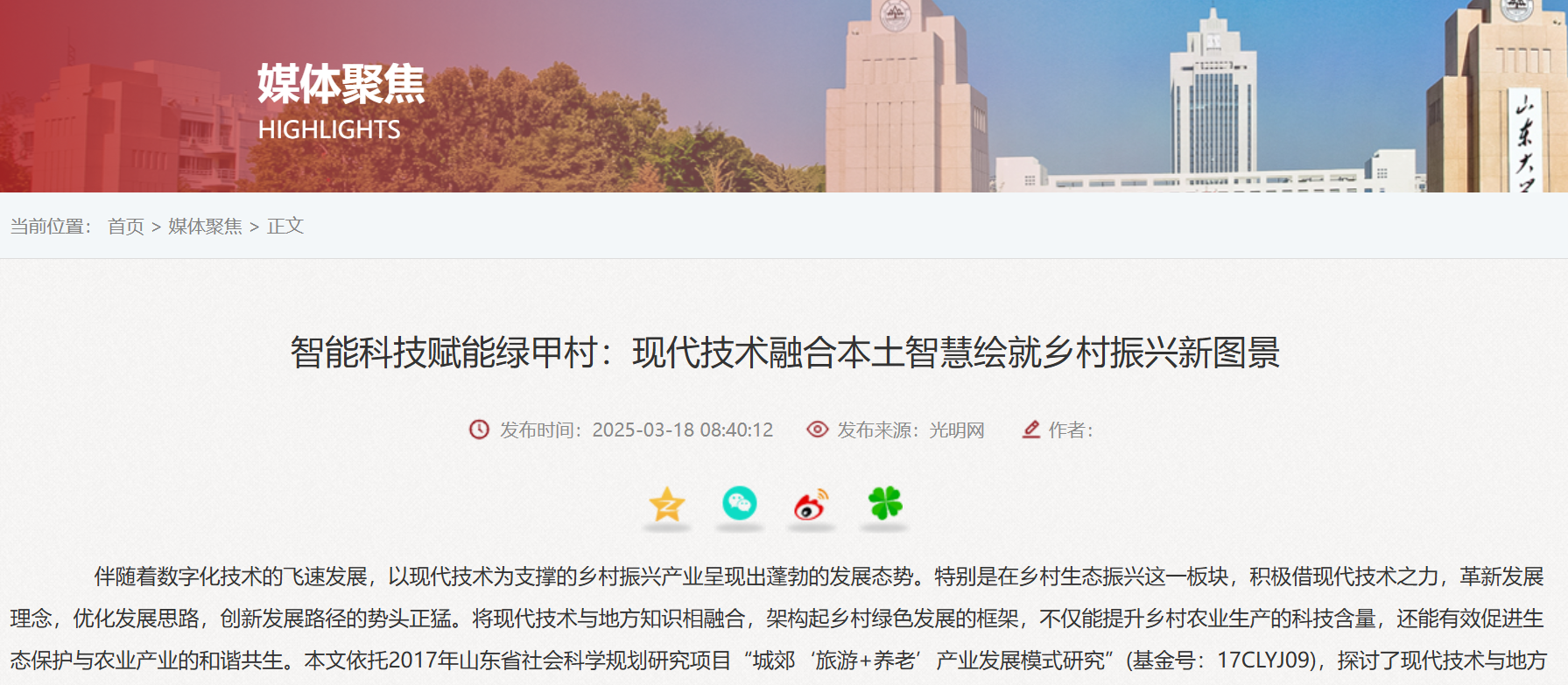 beats365亚洲版人类学系副教授舒萍依托2017年山东省社会科学规划研究项目“城郊‘旅游+养老’产业发展模式研究”(基金号:17CLYJ09),探讨了现代技术与地方知识融合赋能乡村振兴的价值与路径,所撰写文章“智能科技赋能绿甲村:现代技术融合本土智慧绘就乡村振兴新图景”被光明网、山大视点媒体聚焦板块分别报道。