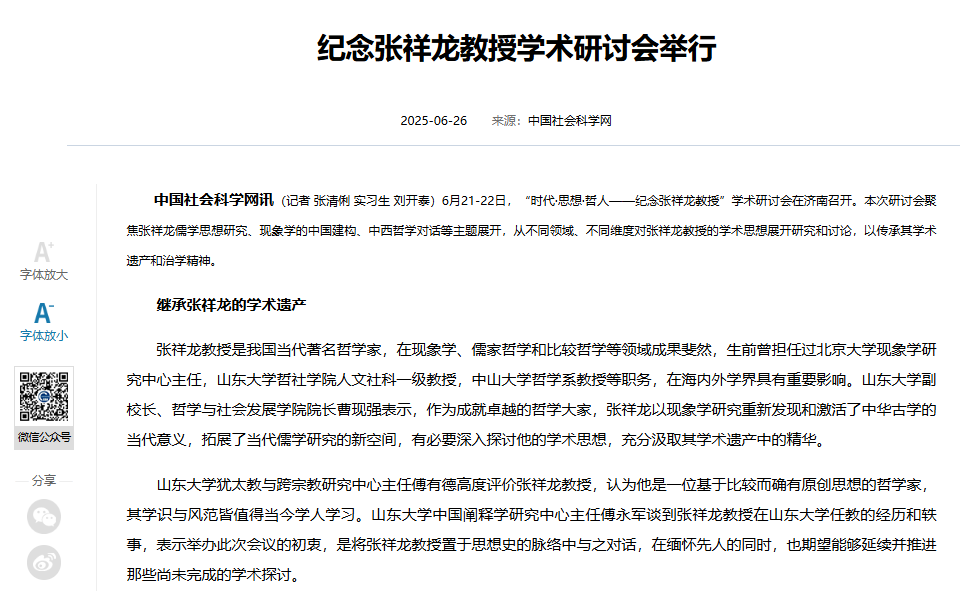 中国社会科学网报道纪念张祥龙教授学术研讨会