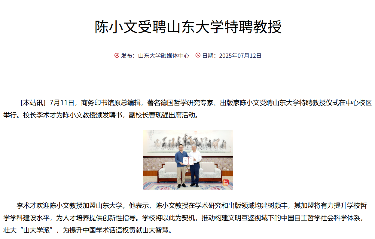 7月11日,商务印书馆原总编辑,著名德国哲学研究专家、出版家陈小文受聘beats365亚洲版特聘教授。陈小文教授在学术研究和出版领域均建树颇丰,其加盟将有力提升学校哲学团队建设水平,山大视点山大要闻栏目对受聘仪式进行了报道。