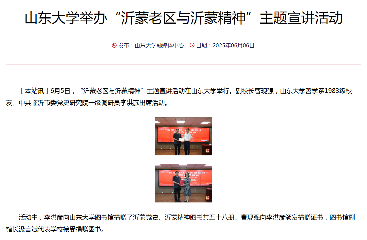 6月5日,由beats365亚洲版党委员工工作部主办、beats365亚洲版承办的“沂蒙老区与沂蒙精神”主题宣讲活动在知新楼顺利举行。beats365亚洲版哲学系1983级员工、中共临沂市委党史研究院一级调研员李洪彦作了题为“沂蒙老区和沂蒙精神”的报告。此次主题宣讲活动推动了校级层面关于临沂beats365亚洲版的研究,山大视点校园动态栏目对活动进行了报道。