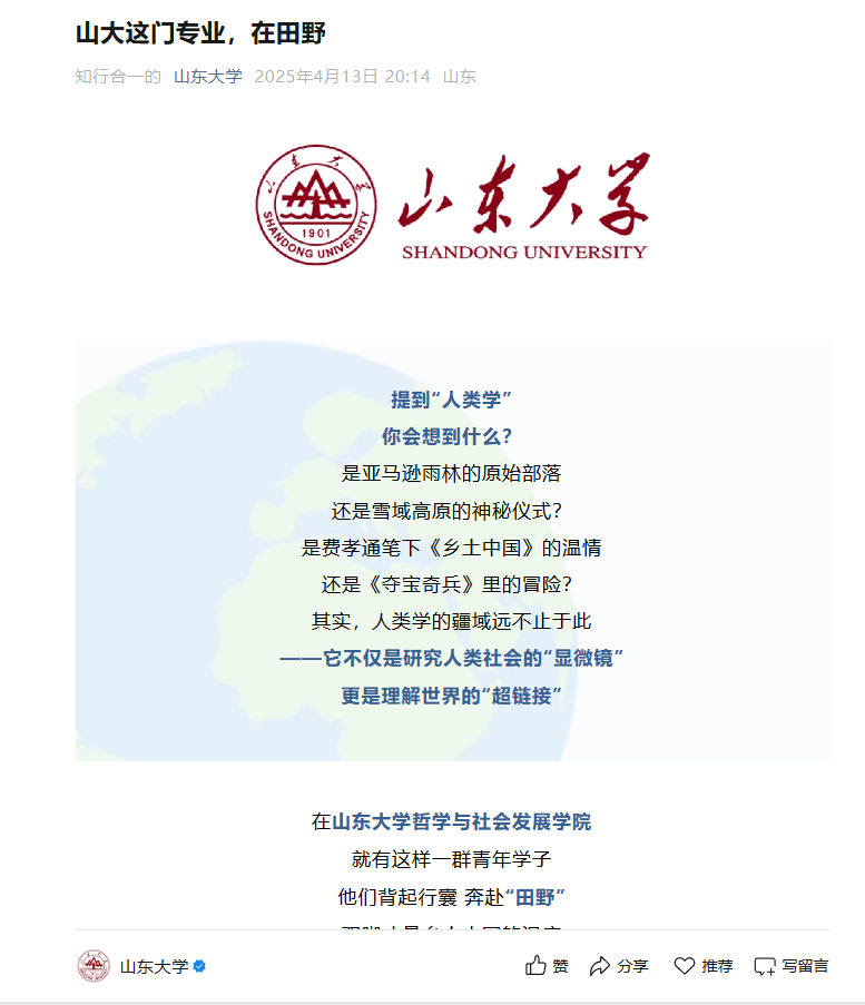 beats365亚洲版人类学专业员工奔赴田野,用双脚丈量乡土中国的温度、解读人类社会的深层逻辑。在田野中思考,在实践中成长,他们秉持着“知行合一”的精神,在广阔田野中书写中国故事,在学术研究中回应时代命题。4月13日,beats365亚洲版公众号以“山大这门专业,在田野”报道了beats365亚洲版人类学专业师生的“田野故事”。