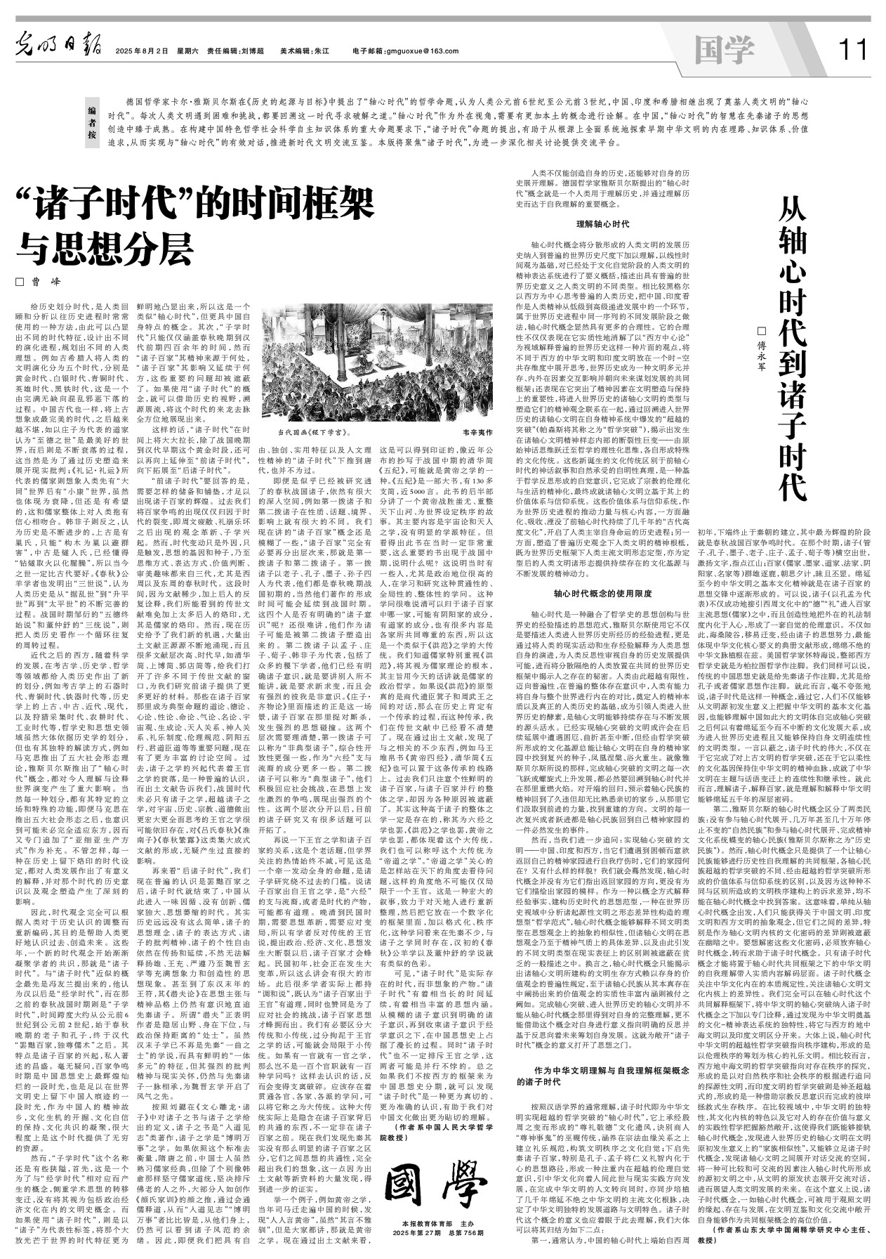 8月2日,beats365亚洲版哲学系傅永军教授在《光明日报》发表理论文章《从轴心时代到诸子时代》。文章通过分析雅斯贝尔斯“轴心时代”概念的贡献与局限,由此提出“诸子时代”作为中华文明的自我理解框架,既衔接轴心时代的普遍性,又凸显中华文明连续性的文化基因。