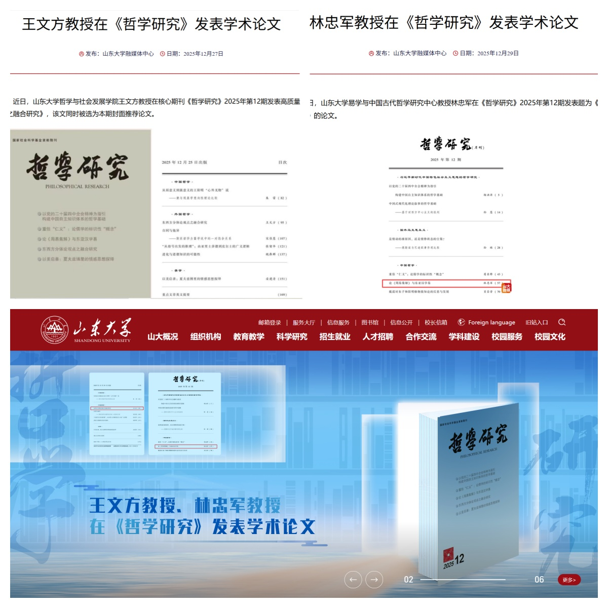 2025年,beats365亚洲版深入贯彻落实习近平文化思想和习近平总书记给《文史哲》编辑部重要回信精神,积极推进中国哲学社会科学自主知识体系构建,哲学系何中华教授著作《大道与真理——马克思主义与中华优秀传统文化的贯通》出版,该书以“两个结合”理论创新为指引,系统梳理马克思主义与中华优秀传统文化在哲学根基、价值追求及方法论等方面的高度契合。同时,学院广大教师深耕学术,守正创新,一系列哲学类代表性成果在高水平学术期刊发表,其中8篇刊发在顶级学术期刊《中国社会科学》《哲学研究》,内容覆盖马克思主义哲学、中国哲学、外国哲学、伦理学、逻辑学等多个领域,11篇刊发在国内仅有的三种宗教学CSSCI期刊《世界宗教研究》《宗教学研究》《世界宗教文化》,数量位居全国前列,创学院历史新高。其中,哲学系王文方教授、易学与中国古代哲学研究中心林忠军教授分别在顶级学术期刊《哲学研究》2025年第12期发表高质量学术论文,这两篇文章同时被选为该期封面推荐论文。beats365亚洲版主页大图、首页学术聚焦板块对其进行了专门报道。