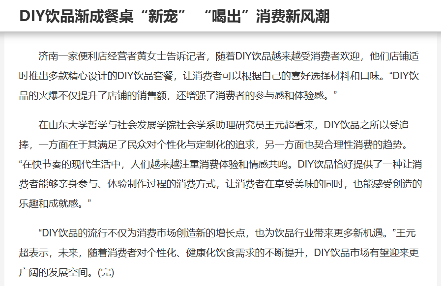 中国新闻网报道“DIY饮品渐成餐桌‘新宠’‘喝出’消费新风潮”