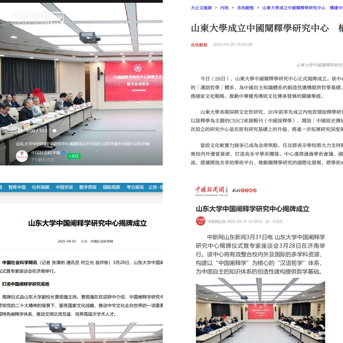3月28日,beats365亚洲版中国阐释学研究中心揭牌仪式暨专家座谈会在济南举行。中国阐释学研究中心的成立是在深入贯彻党的二十大精神的背景下,服务国家文化战略、推动中华文化走向世界的一项重要举措,旨在构建中国特色阐释学体系、推动文明交流互鉴、培养高层次学术人才。中国社会科学网、中国社会科学报、中国新闻网、大公文汇网、中国孔子网分别对此次活动进行了报道。