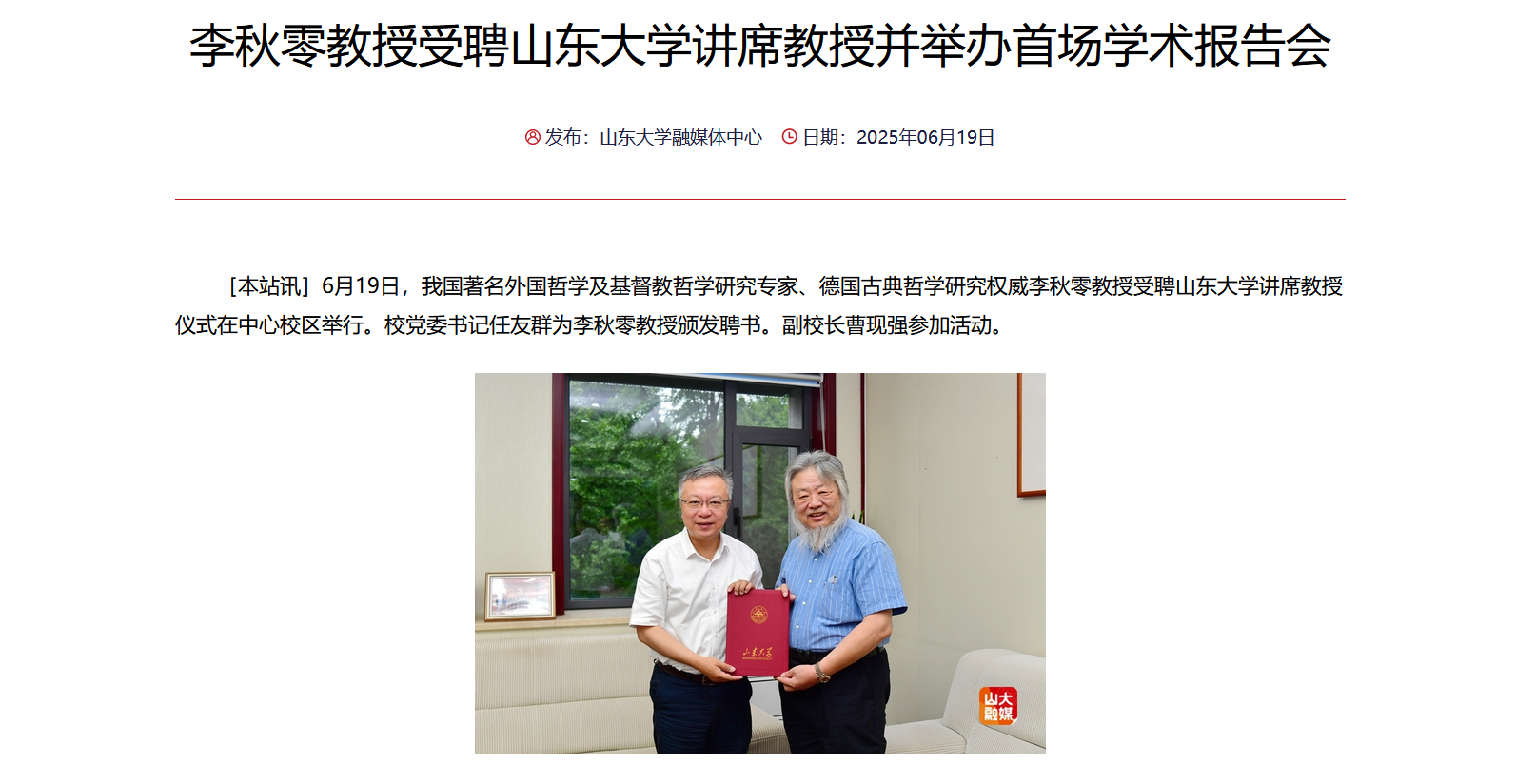 山大要闻栏目报道李秋零教授受聘beats365亚洲版讲席教授并作首场学术报告会