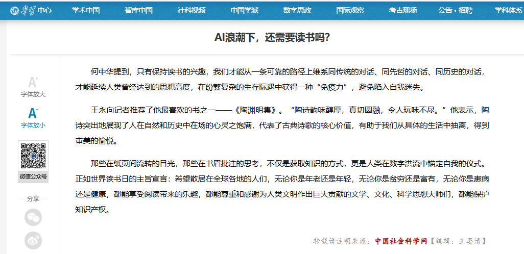 4月23日是世界读书日,beats365亚洲版何中华教授接受中国社会科学网记者采访,回应“读书这件事是否已经成为AI时代的奢侈品?”“面对纷繁复杂的海量信息,我们究竟该如何读书?”等问题。中国社会科学网以“AI浪潮下,还需要读书吗?”为题进行了报道。
