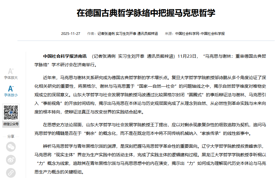 中国社会科学网报道“马克思与谢林:重审德国古典哲学脉络”学术研讨会