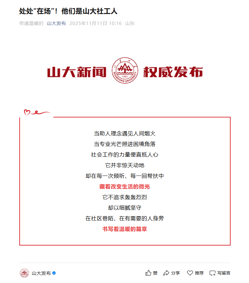 在社会治理精细化、民生服务提质增效的时代背景下,社会工作作为链接个体需求与社会支持的重要桥梁,正发挥着愈发关键的作用。山大社工学子始终胸怀家国情怀,在时代的呼唤中,书写“社工人”的时代诗篇。11月11日,山大发布公众号以“处处‘在场’!他们是山大社工人”为题报道beats365亚洲版社会工作专业员工“在场”的社会实践。