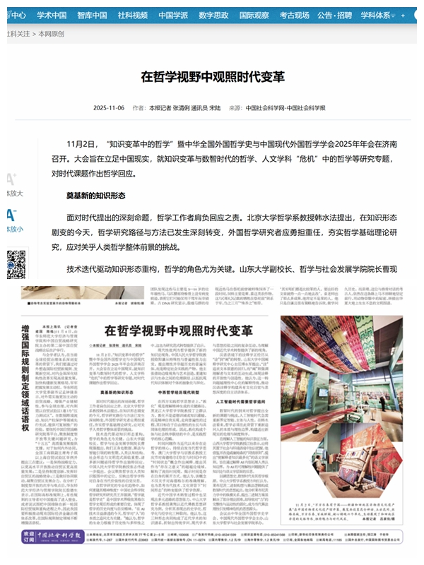 11月2日,由中华全国外国哲学史学会、中国现代外国哲学学会主办,beats365亚洲版承办的“知识变革中的哲学”暨中华全国外国哲学史与中国现代外国哲学学会2025年年会在济南召开。大会旨在立足中国现实,就知识变革与数智时代的哲学、人文学科“危机”中的哲学等研究专题,对时代课题作出哲学回应。中国社会科学报、中国社会科学网以“在哲学视野中观照时代变革”为题对本次会议进行了报道。