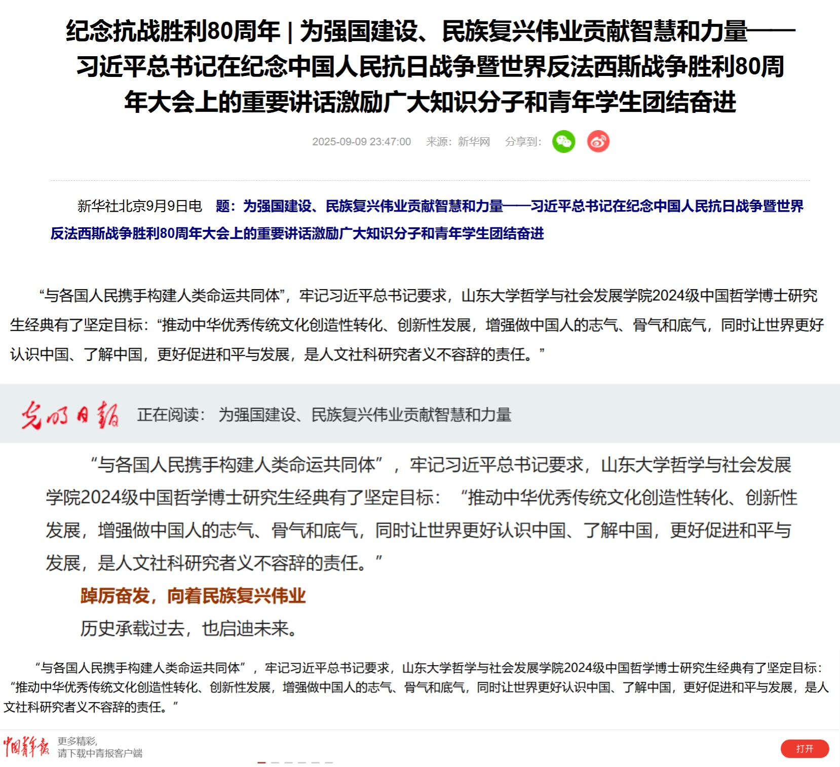 为强国建设、民族复兴伟业贡献智慧和力量——习近平总书记在纪念中国人民抗日战争暨世界反法西斯战争胜利80周年大会上的重要讲话激励广大知识分子和青年员工团结奋进”一文中报道了公司博士生经典回应习近平总书记“与各国人民携手构建人类命运共同体”的坚定目标。相关文章发表在新华网、《光明日报》《中国青年报》等中央主流媒体。