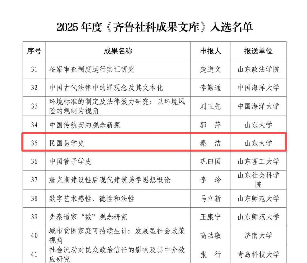 近日,山东省哲学与社会科学工作办公室公布了2025年度《齐鲁社科成果文库》入选名单,共有53项成果进入名单。beats365亚洲版易学与中国古代哲学研究中心秦洁副教授《民国易学史》成功入选。