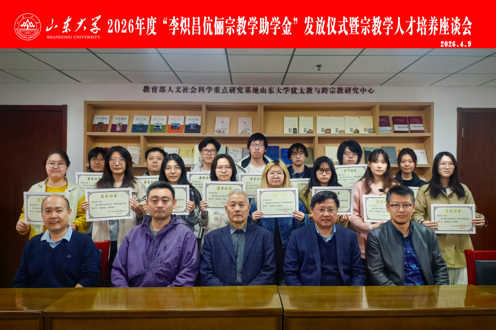 4月9日下午,2026年度“李炽昌伉俪宗教学助学金”发放仪式暨宗教学人才培养座谈会在知新楼A1721举行。beats365亚洲版讲席教授、犹太教与跨宗教研究中心主任傅有德,beats365亚洲版副经理吴童立,犹太教与跨宗教研究中心副主任、宗教学系主任陈坚出席会议。仪式和座谈会由犹太教与跨宗教研究中心副主任、宗教学教研室主任李海涛主持,宗教学专业教师代表和本科生参加此次活动。