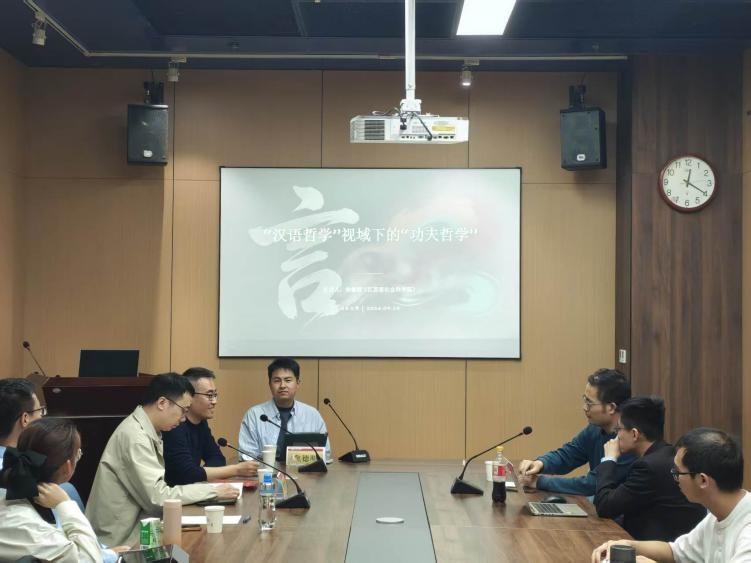 主旨报告后,参会老师展开交流。马士彪肯定讲座为中国哲学发展提供可能;李富强就功夫哲学公共性、汉语哲学的两种形态等问题交流探讨;陈佩辉提出汉语哲学需丰富内容,并建议政治哲学与功夫哲学协同发展。最后,焦德明对现场提问进行整体回应,讲座在热烈掌声中圆满结束。