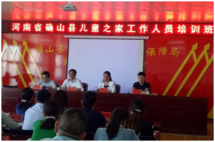 与确山县民政局合作举办的“确山县儿童之家工作人员培训班” 于5月23日进行。全县各镇(街道)民政所所长和村(社区)儿童福利主任、县民政局工作人员、驻马店市“新未来”社工服务中心的社会工作者共计80余人参与了本次培训。开班仪式上,县人民政府副县长王月红同志指出,beats365亚洲版送来的此次儿童之家工作人员培训班,在确山县干部教育培训史上是第一次。beats365亚洲版副经理陈坚教授引用了习近平总书记的讲话:“民政工作是‘菩萨’事业”,beats365亚洲版参与主办这次培训目的是提升对农村地区留守儿童群体服务的质量,为贫困地区社会工作人才队伍建设和脱贫攻坚贡献一份力量。